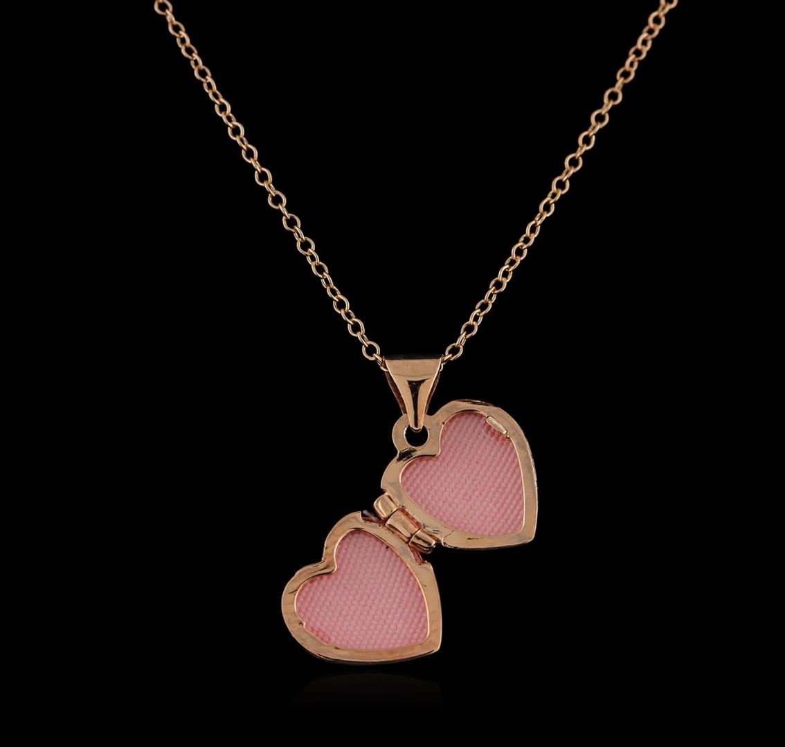 One heart shape locket pendant with chain featuring: 14KT rose gold weighing 1.70 grams.