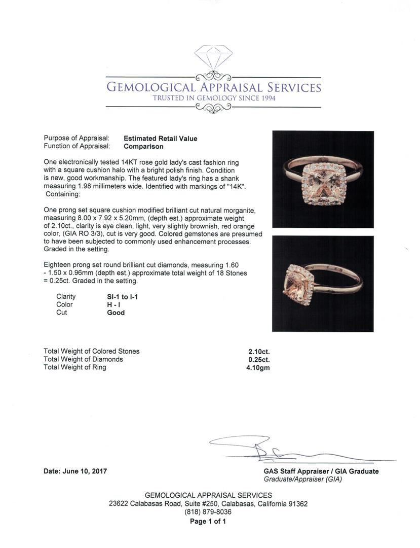 One electronically tested 14KT rose gold lady's cast fashion ring with a square cushion halo with a bright polish finish. The featured lady's ring has a shank measuring 1.98 millimeters wide. Identified with markings of '14K'. Condition is new, good workmanship. Containing: One prong set square cushion modified brilliant cut natural morganite, measuring 8.00 x 7.92 x 5.20mm, (depth est.) approximate weight of 2.10ct., clarity is eye clean, light, very slightly brownish, red orange color, (GIA RO 3/3), cut is very good. Colored gemstones are presumed to have been subjected to commonly used enhancement processes. Graded in the setting. Eighteen prong set round brilliant cut diamonds, measuring 1.60 - 1.50 x 0.96mm (depth est.) approximate total weight of 18 Stones = 0.25ct. Graded in the setting. Color H - I Clarity SI-1 to I-1 Cut Good. Total Weight of Colored Stones 2.10ct.. Total Weight of Diamonds 0.25ct.. Total Weight of Ring 4.10gm GAS Appraised.