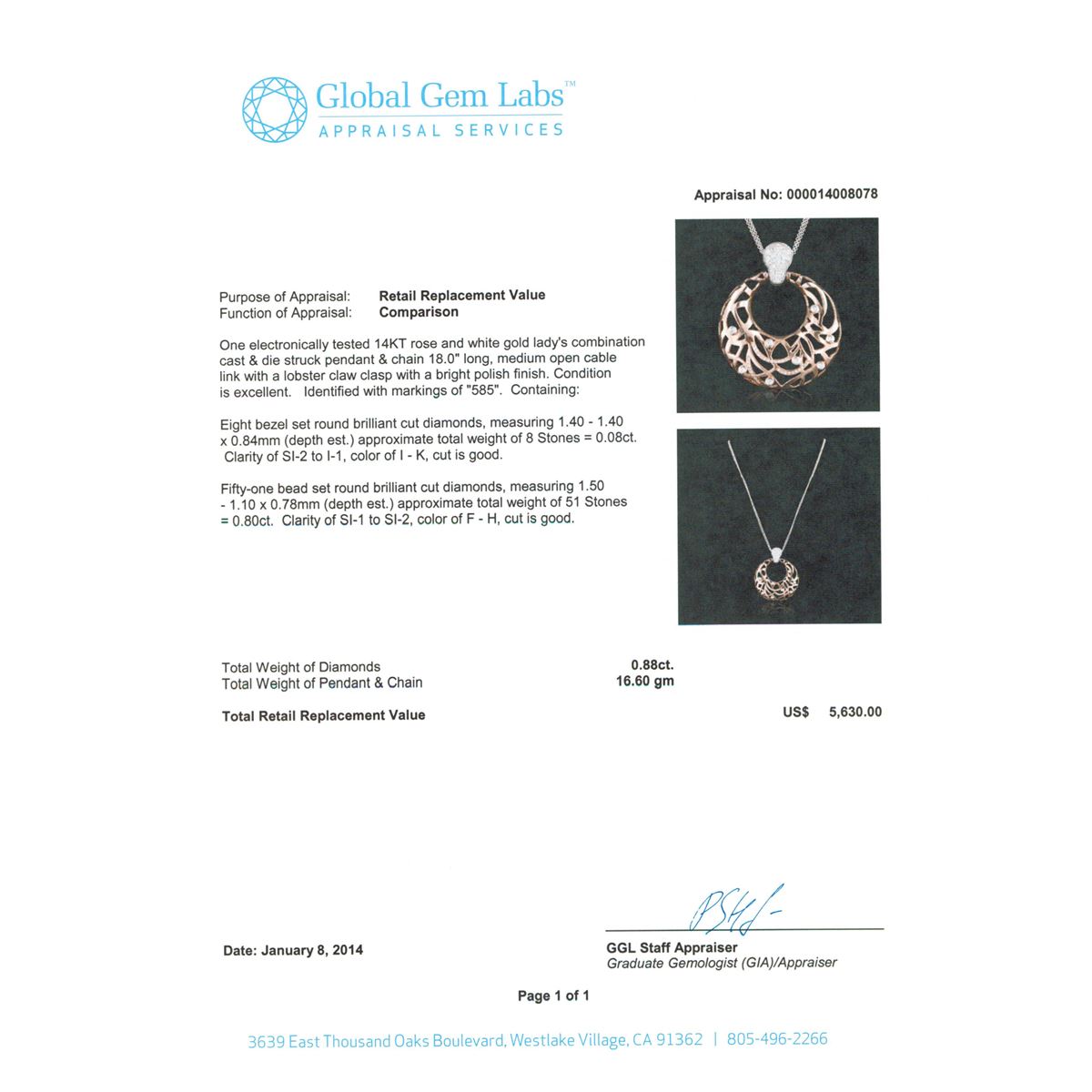 One electronically tested 14KT rose and white gold Ladies combination cast & die struck pendant & chain 18.0" long, medium open cable link with a lobster claw clasp with a bright polish finish. Identified with markings of "585". Condition is excellent. Containing: Eight bezel set round brilliant cut diamonds, measuring 1.40 - 1.40 x 0.84mm (depth est.) approximate total weight of 8 Stones = 0.08ct. Clarity of SI-2 to I-1, Color of I - K, Cut is Good. Fifty-One bead set round brilliant cut diamonds, measuring 1.50 - 1.10 x 0.78mm (depth est.) approximate total weight of 51 Stones = 0.80ct. Clarity of SI-1 to SI-2, Color of F - H, Cut is Good. Total Weight of Diamonds 0.88ct. Total Weight of Pendant & Chain 16.60gm. GGL Appraised at $5,630.00.