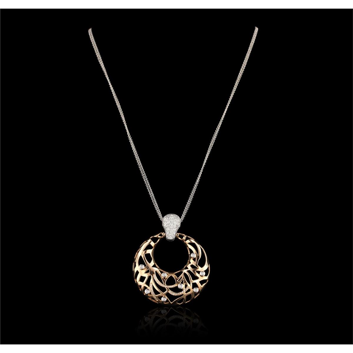One electronically tested 14KT rose and white gold Ladies combination cast & die struck pendant & chain 18.0" long, medium open cable link with a lobster claw clasp with a bright polish finish. Identified with markings of "585". Condition is excellent. Containing: Eight bezel set round brilliant cut diamonds, measuring 1.40 - 1.40 x 0.84mm (depth est.) approximate total weight of 8 Stones = 0.08ct. Clarity of SI-2 to I-1, Color of I - K, Cut is Good. Fifty-One bead set round brilliant cut diamonds, measuring 1.50 - 1.10 x 0.78mm (depth est.) approximate total weight of 51 Stones = 0.80ct. Clarity of SI-1 to SI-2, Color of F - H, Cut is Good. Total Weight of Diamonds 0.88ct. Total Weight of Pendant & Chain 16.60gm. GGL Appraised at $5,630.00.