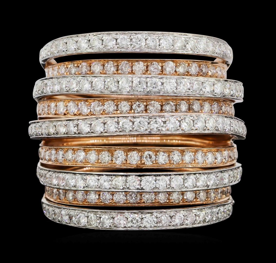 One electronically tested 14KT rose with white rhodium gold lady's cast fashion ring with a wide band with a bright polish finish. The featured lady's ring has nine staggered rows of diamonds set in alternating white and rose gold and a shank measuring 11.80 millimeters wide. Identified with markings of "585". Condition is used, good workmanship. Containing: Two Hundred Fourteen prong set round brilliant cut diamonds, measuring 1.50 - 1.40 x 0.90mm (depth est.) approximate total weight of 214 Stones = 2.50ct. Graded in the setting. Clarity: SI-1 to I-1. Color: H - ICut Good. Total Weight of Diamonds 2.50ct. Total Weight of Ring 13.80gm. GAS Appraised.