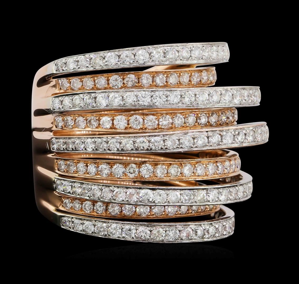 One electronically tested 14KT rose with white rhodium gold lady's cast fashion ring with a wide band with a bright polish finish. The featured lady's ring has nine staggered rows of diamonds set in alternating white and rose gold and a shank measuring 11.80 millimeters wide. Identified with markings of "585". Condition is used, good workmanship. Containing: Two Hundred Fourteen prong set round brilliant cut diamonds, measuring 1.50 - 1.40 x 0.90mm (depth est.) approximate total weight of 214 Stones = 2.50ct. Graded in the setting. Clarity: SI-1 to I-1. Color: H - ICut Good. Total Weight of Diamonds 2.50ct. Total Weight of Ring 13.80gm. GAS Appraised.