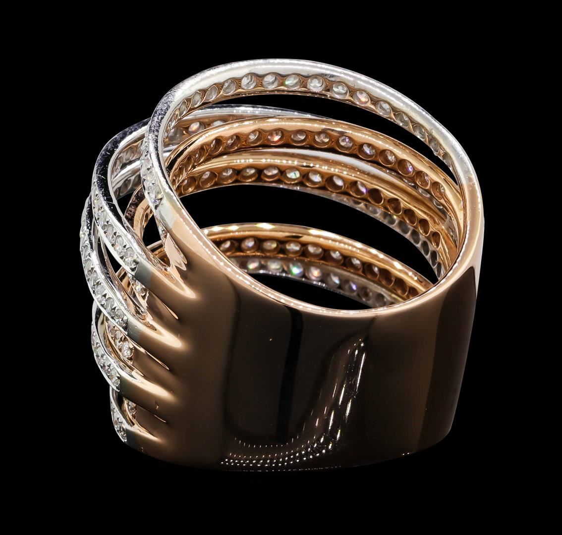 One electronically tested 14KT rose with white rhodium gold lady's cast fashion ring with a wide band with a bright polish finish. The featured lady's ring has nine staggered rows of diamonds set in alternating white and rose gold and a shank measuring 11.80 millimeters wide. Identified with markings of "585". Condition is used, good workmanship. Containing: Two Hundred Fourteen prong set round brilliant cut diamonds, measuring 1.50 - 1.40 x 0.90mm (depth est.) approximate total weight of 214 Stones = 2.50ct. Graded in the setting. Clarity: SI-1 to I-1. Color: H - ICut Good. Total Weight of Diamonds 2.50ct. Total Weight of Ring 13.80gm. GAS Appraised.