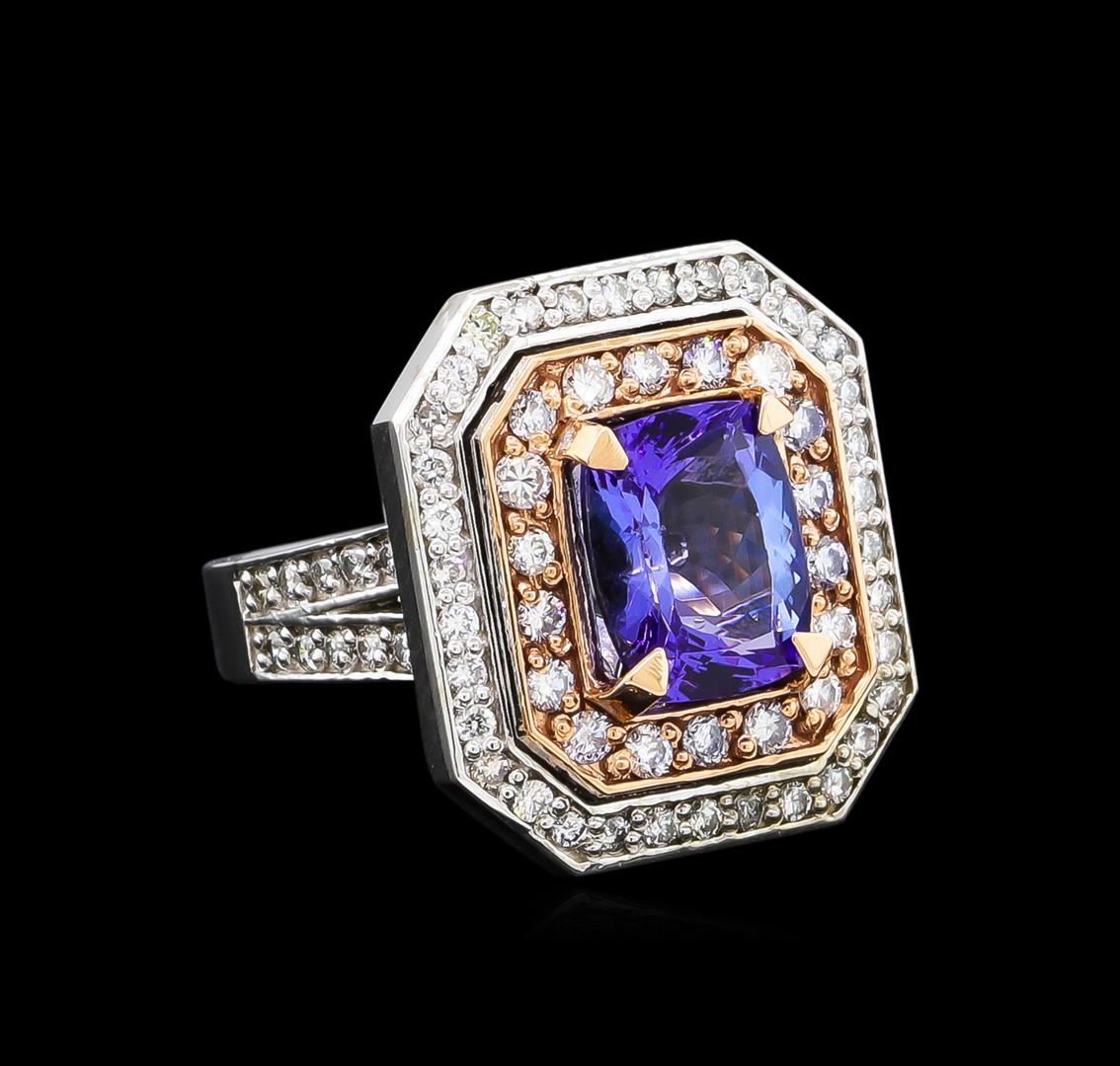 One electronically tested 14KT rose and white gold Ladies combination cast & assembled ring with a bright polish finish. Condition is new. Identified with markings of "K14". Containing: One prong set rectangular cushion modified brilliant cut natural tanzanite, measuring 9.92 x 8.44 x 4.70mm, approximate weight of 3.10ct., clarity is eye clean, type I, medium, very slightly grayish, violet color, (GIA V 5/3), cut is very good. Colored gemstones are presumed to have been subjected to commonly used color/clarity enhancement processes. Seventy-Four prong set round brilliant cut diamonds, measuring 1.40 - 1.40 x 0.46mm (depth est.) approximate. Total Weight of 74 Stones = 0.41ct. Clarity: SI-2 to I-1. Color: H - I, Cut is Good. Total Weight of Colored Stones 3.10ct. Total Weight of Diamonds 0.41ct. Total Weight of Ring 11.60 grams. GGL Appraised at $9,150.00.