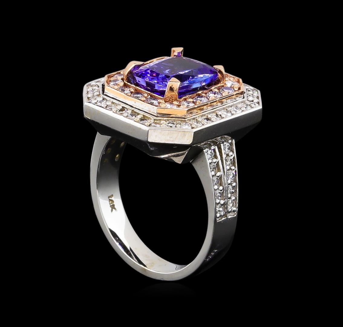 One electronically tested 14KT rose and white gold Ladies combination cast & assembled ring with a bright polish finish. Condition is new. Identified with markings of "K14". Containing: One prong set rectangular cushion modified brilliant cut natural tanzanite, measuring 9.92 x 8.44 x 4.70mm, approximate weight of 3.10ct., clarity is eye clean, type I, medium, very slightly grayish, violet color, (GIA V 5/3), cut is very good. Colored gemstones are presumed to have been subjected to commonly used color/clarity enhancement processes. Seventy-Four prong set round brilliant cut diamonds, measuring 1.40 - 1.40 x 0.46mm (depth est.) approximate. Total Weight of 74 Stones = 0.41ct. Clarity: SI-2 to I-1. Color: H - I, Cut is Good. Total Weight of Colored Stones 3.10ct. Total Weight of Diamonds 0.41ct. Total Weight of Ring 11.60 grams. GGL Appraised at $9,150.00.