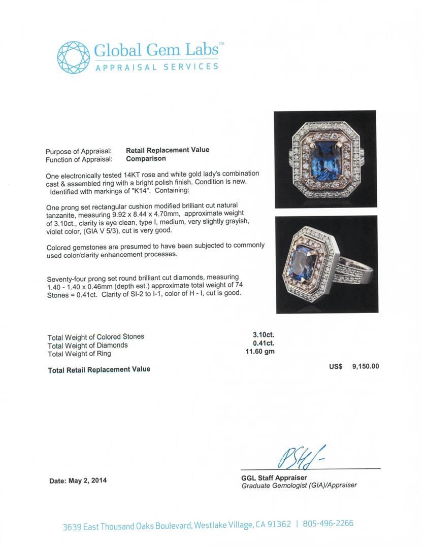 One electronically tested 14KT rose and white gold Ladies combination cast & assembled ring with a bright polish finish. Condition is new. Identified with markings of "K14". Containing: One prong set rectangular cushion modified brilliant cut natural tanzanite, measuring 9.92 x 8.44 x 4.70mm, approximate weight of 3.10ct., clarity is eye clean, type I, medium, very slightly grayish, violet color, (GIA V 5/3), cut is very good. Colored gemstones are presumed to have been subjected to commonly used color/clarity enhancement processes. Seventy-Four prong set round brilliant cut diamonds, measuring 1.40 - 1.40 x 0.46mm (depth est.) approximate. Total Weight of 74 Stones = 0.41ct. Clarity: SI-2 to I-1. Color: H - I, Cut is Good. Total Weight of Colored Stones 3.10ct. Total Weight of Diamonds 0.41ct. Total Weight of Ring 11.60 grams. GGL Appraised.