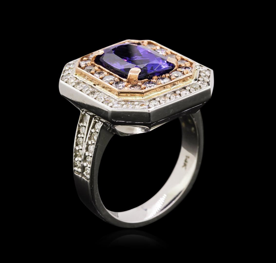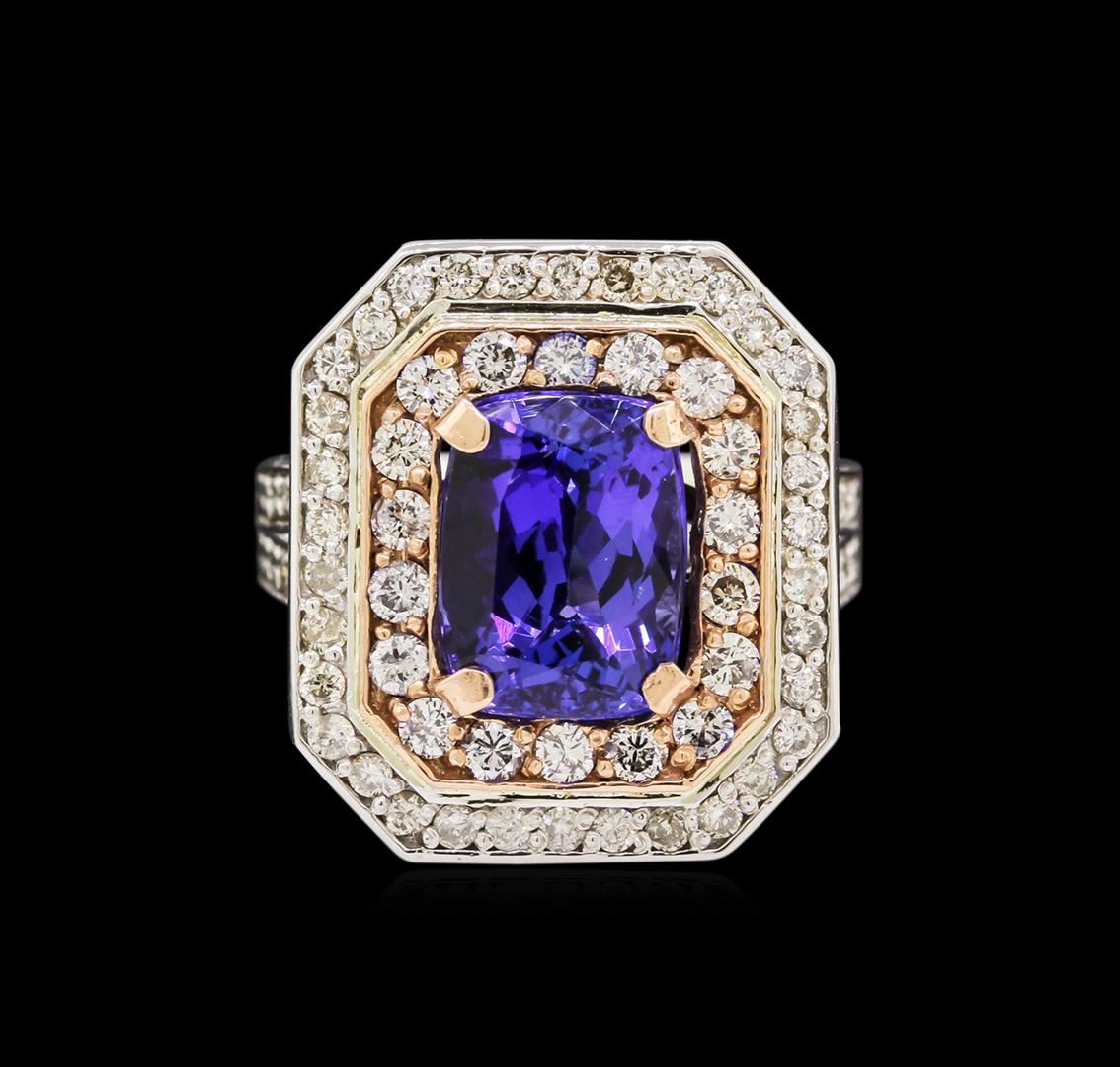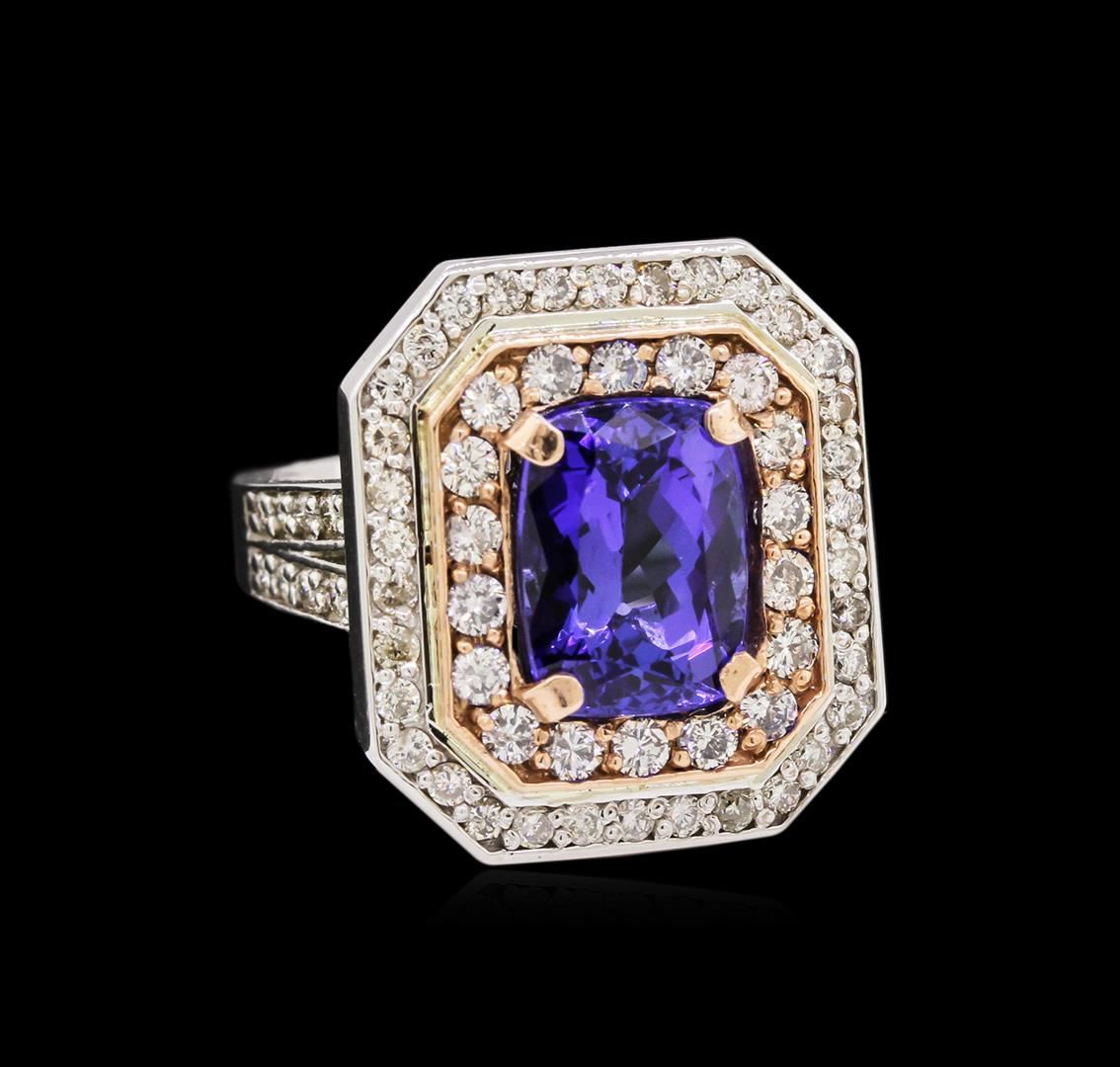 One electronically tested 14KT rose and white gold Ladies combination cast & assembled ring with a bright polish finish. Condition is new. Identified with markings of "14K". Containing: One prong set rectangular cushion modified brilliant cut natural tanzanite, measuring 10.20 x 8.49 x 6.30mm, approximate weight of 4.29ct., clarity is eye clean, type I, medium, moderately strong, violetish blue color, (GIA vB 5/4), cut is very good. Colored gemstones are presumed to have been subjected to commonly used color/clarity enhancement processes. Thirty-Five prong set round brilliant cut diamonds, measuring 1.30 - 1.30 x 0.78mm (depth est.) approximate. Total Weight of 35 Stones = 0.35ct. Clarity: I-1 to I-2. Color: I - J, Cut is Good. Eighteen prong set round brilliant cut diamonds, measuring 1.80 - 1.80 x 1.08mm (depth est.) approximate. Total Weight of 18 Stones = 0.38ct. Clarity: I-1 to I-2. Color: I - J, Cut is Good. Total Weight of Colored Stones 4.29ct. Total Weight of Diamonds 0.73ct. Total Weight of Ring 11.30 grams. GGL Appraised at $10,950.00.