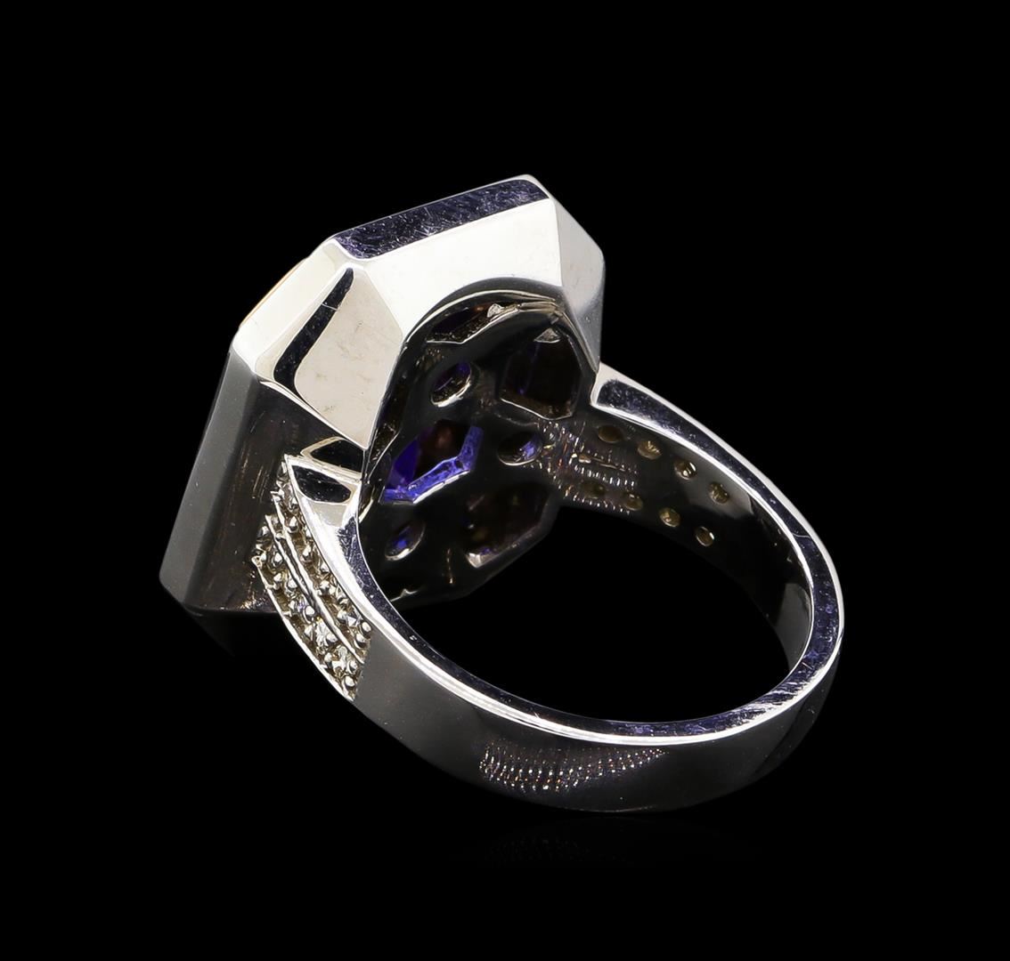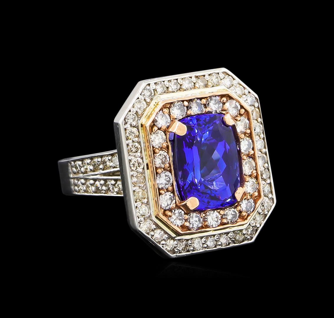 One electronically tested 14KT rose and white gold Ladies combination cast & assembled ring with a bright polish finish. Condition is new. Identified with markings of "14K". Containing: One prong set rectangular cushion modified brilliant cut natural tanzanite, measuring 10.20 x 8.49 x 6.30mm, approximate weight of 4.29ct., clarity is eye clean, type I, medium, moderately strong, violetish blue color, (GIA vB 5/4), cut is very good. Colored gemstones are presumed to have been subjected to commonly used color/clarity enhancement processes. Thirty-Five prong set round brilliant cut diamonds, measuring 1.30 - 1.30 x 0.78mm (depth est.) approximate. Total Weight of 35 Stones = 0.35ct. Clarity: I-1 to I-2. Color: I - J, Cut is Good. Eighteen prong set round brilliant cut diamonds, measuring 1.80 - 1.80 x 1.08mm (depth est.) approximate. Total Weight of 18 Stones = 0.38ct. Clarity: I-1 to I-2. Color: I - J, Cut is Good. Total Weight of Colored Stones 4.29ct. Total Weight of Diamonds 0.73ct. Total Weight of Ring 11.30 grams. GGL Appraised at $10,950.00.