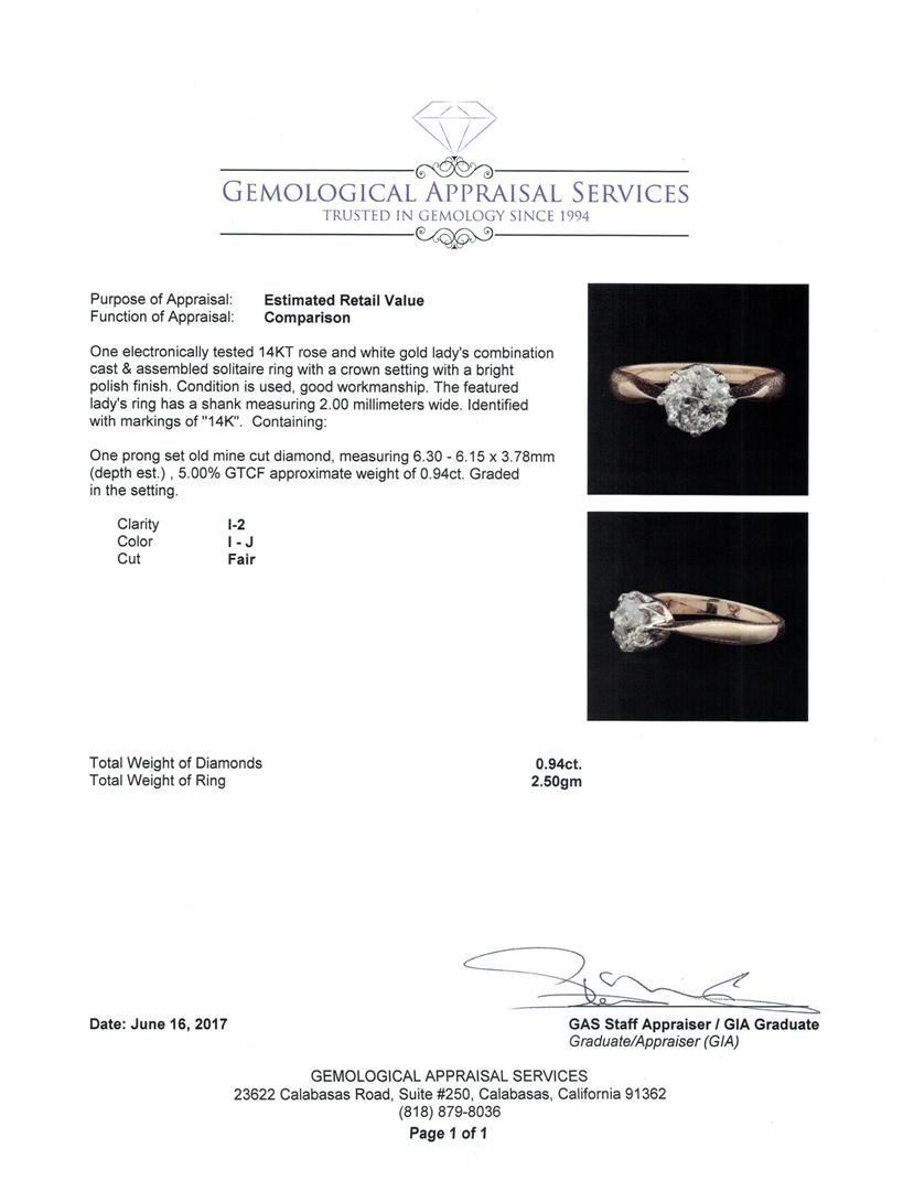 One electronically tested 14KT rose and white gold lady's combination cast & assembled solitaire ring with a crown setting with a bright polish finish. The featured lady's ring has a shank measuring 2.00 millimeters wide. Identified with markings of '14K'. Condition is used, good workmanship. Containing: One prong set old mine cut diamond, measuring 6.30 - 6.15 x 3.78mm (depth est.) , 5.00.%. GTCF approximate weight of 0.94ct. Graded in the setting. Color I - J Clarity I-2 Cut Fair. Total Weight of Diamonds 0.94ct.. Total Weight of Ring 2.50gm GAS Appraised.