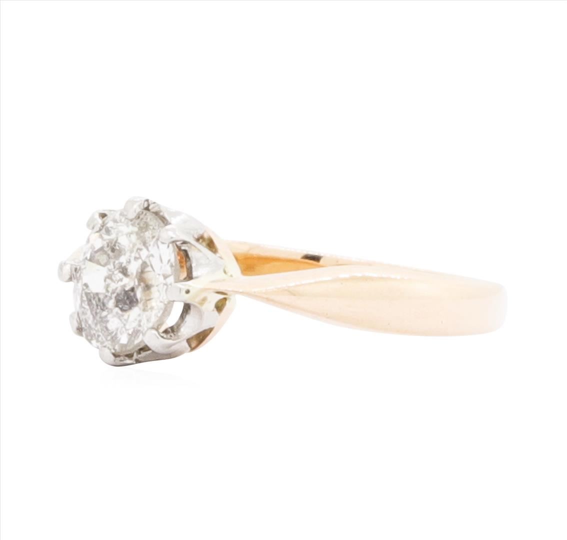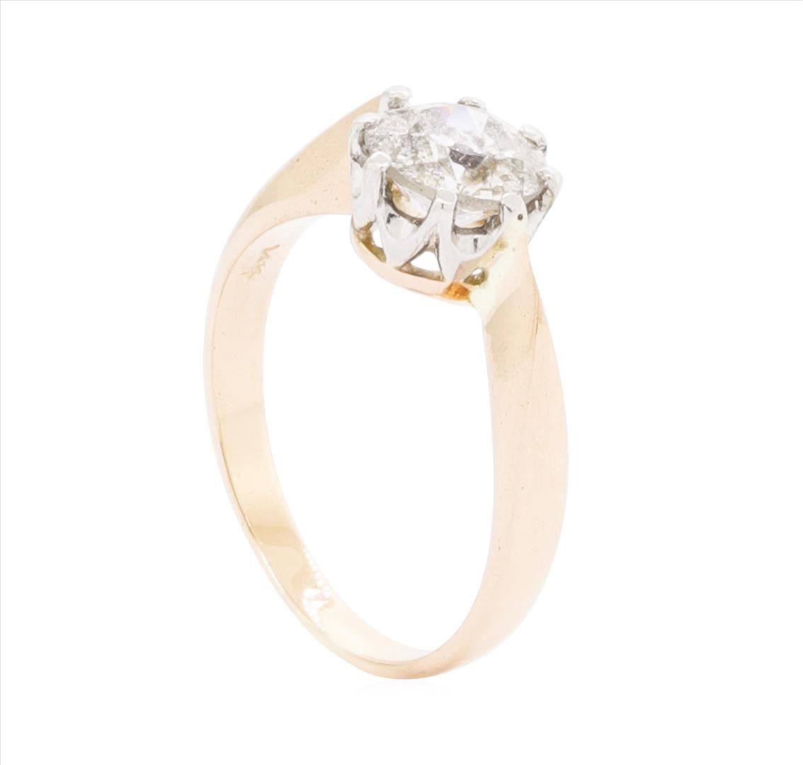 One electronically tested 14KT rose and white gold lady's combination cast & assembled solitaire ring with a crown setting with a bright polish finish. The featured lady's ring has a shank measuring 2.00 millimeters wide. Identified with markings of '14K'. Condition is used, good workmanship. Containing: One prong set old mine cut diamond, measuring 6.30 - 6.15 x 3.78mm (depth est.) , 5.00.%. GTCF approximate weight of 0.94ct. Graded in the setting. Color I - J Clarity I-2 Cut Fair. Total Weight of Diamonds 0.94ct.. Total Weight of Ring 2.50gm GAS Appraised.