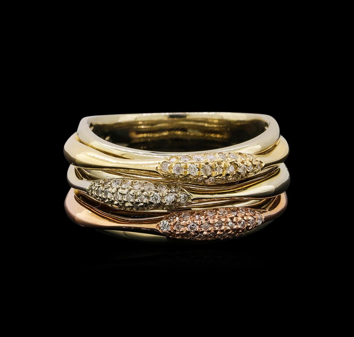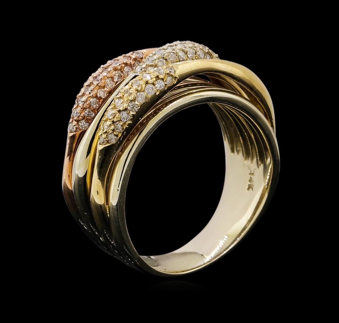 One electronically tested 14KT rose, yellow and white gold ladies combination cast & assembled diamond ring with a bright polish finish. Identified with markings of "14K". Condition is new. Containing: Seventy-Five prong set round brilliant cut diamonds, measuring 1.00 - 1.00 x 0.60mm (depth est.) approximate total weight of 75 Stones = 0.27ct. Clarity: I-1 to I-2. Color: I - J, Cut is Good. All diamonds are graded in the mounting, unless otherwise stated. Total Weight of Diamonds 0.27ct. Total Weight of Ring 9.10 grams. GGL Appraised at $3,500.00.