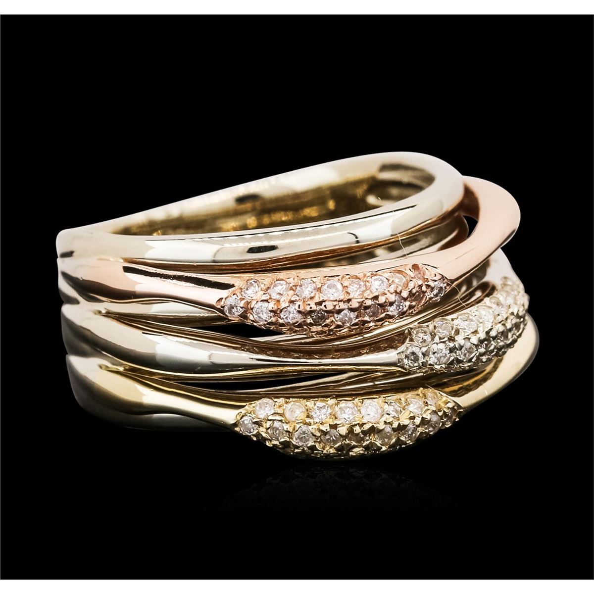 One electronically tested 14KT rose, yellow and white gold ladies combination cast & assembled diamond ring with a bright polish finish. Identified with markings of "14K". Condition is new. Containing: Seventy-Five prong set round brilliant cut diamonds, measuring 1.00 - 1.00 x 0.60mm (depth est.) approximate total weight of 75 Stones = 0.27ct. Clarity: I-1 to I-2. Color: I - J, Cut is Good. All diamonds are graded in the mounting, unless otherwise stated. Total Weight of Diamonds 0.27ct. Total Weight of Ring 9.10 grams. GGL Appraised at $3,500.00.