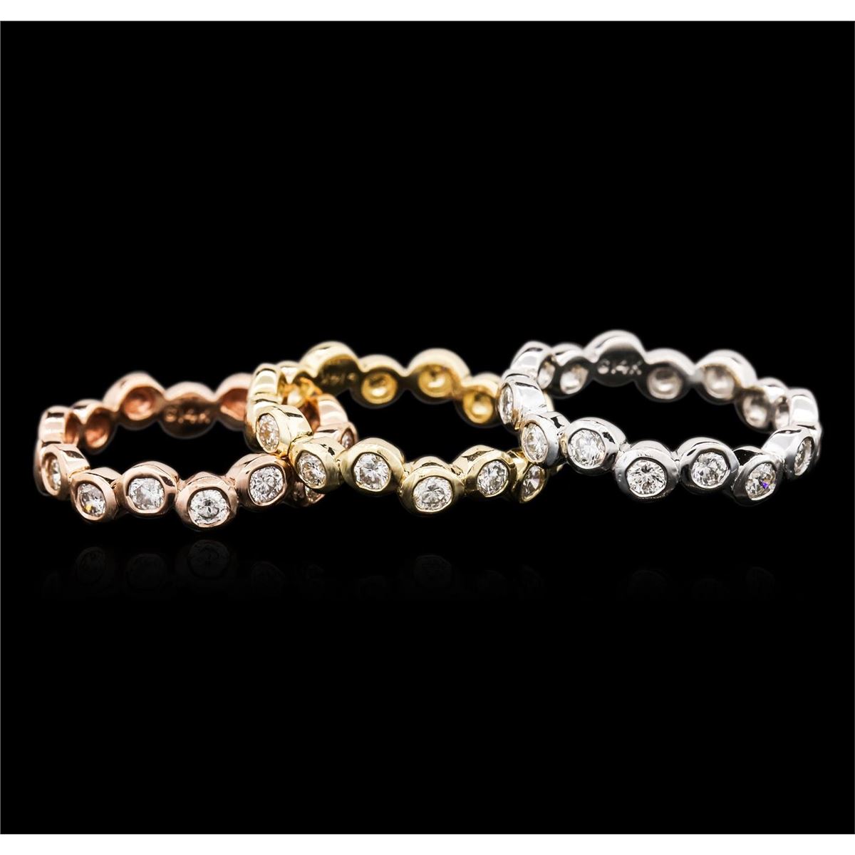 Three electronically tested 14KT rose, yellow and white gold ladies cast diamond wedding bands with a bright polish finish. Identified with markings of "14K". Condition is new. Containing: Twenty-Four bezel set round brilliant cut diamonds, measuring 2.50 - 2.50 x 1.50mm (depth est.) approximate total weight of 24 Stones = 1.37ct. Clarity: SI-1 to SI-2. Color: I - J, Cut is Good. All diamonds are graded in the mounting, unless otherwise stated. Total Weight of Diamonds 1.37ct. Total Weight of Wedding Bands 8.90 grams. GGL Appraised at $5,555.00.