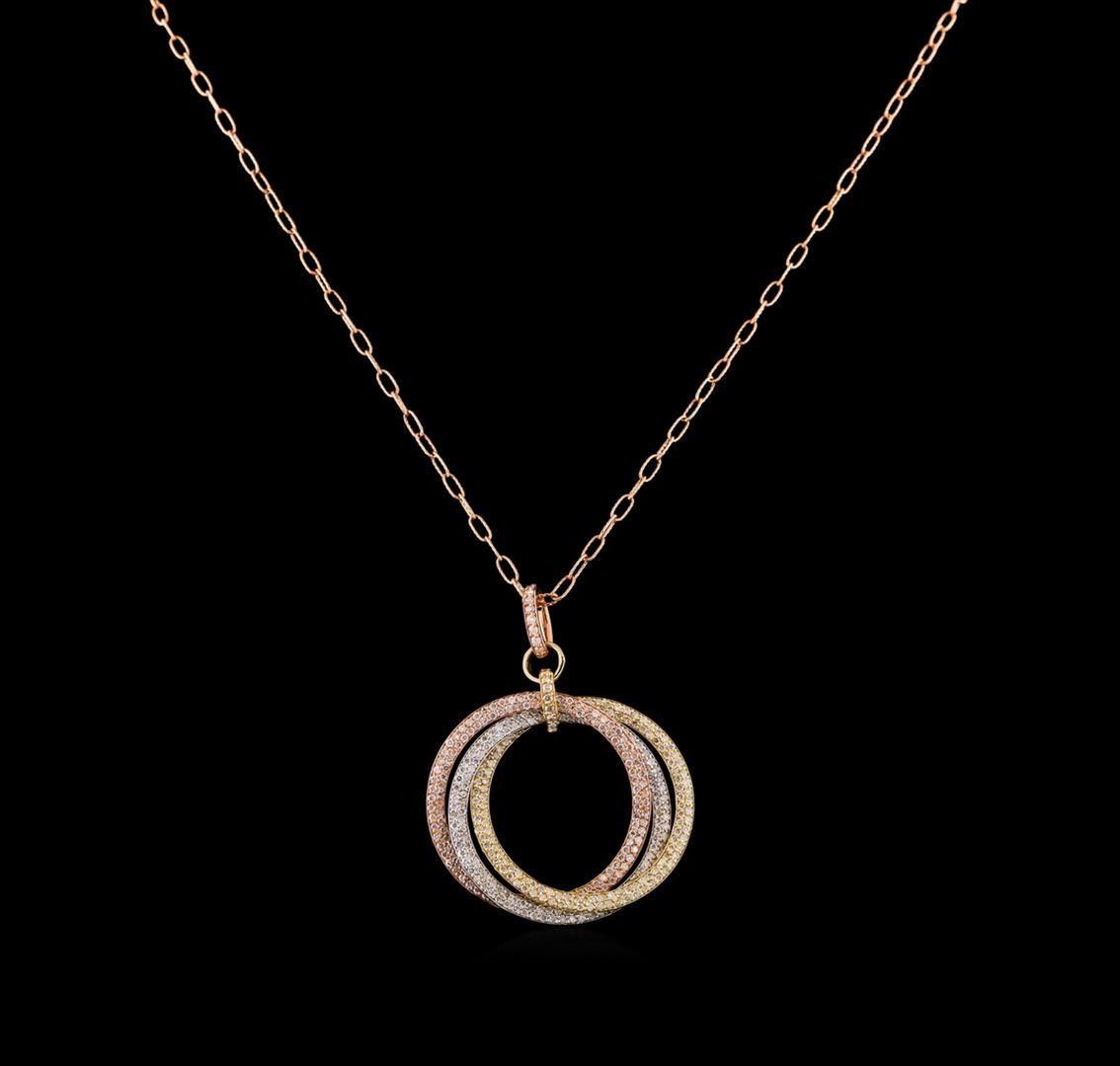 One electronically tested 14KT rose, yellow and white gold ladies combination cast & assembled diamond pendant & chain 18.0" long, figaro link with a lobster claw clasp with a bright polish finish. Identified with markings of "K14". Condition is new. Containing: Four Hundred Eight prong set round brilliant cut diamonds, measuring 1.00 - 1.00 x 0.60mm (depth est.) approximate total weight of 408 Stones = 1.47ct. Clarity: I-2 to I-3. Color: J - K. Eight prong set round brilliant cut diamonds, measuring 1.30 - 1.30 x 0.78mm (depth est.) approximate total weight of 8 Stones = 0.06ct. Clarity: I-2 to I-3. Color: I - J. All diamonds are graded in the mounting, unless otherwise stated. Total Weight of Diamonds 1.53ct. Total Weight of Pendant & Chain 15.70 grams. GGL Appraised.