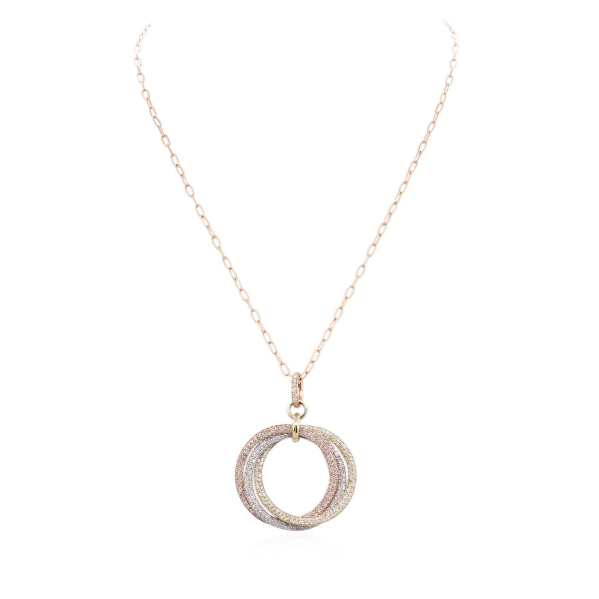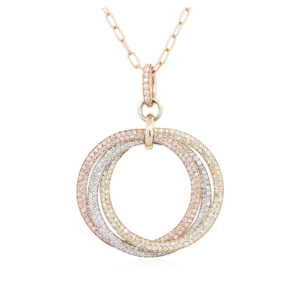 One electronically tested 14KT rose, yellow and white gold ladies combination cast & assembled diamond pendant & chain 18.0" long, figaro link with a lobster claw clasp with a bright polish finish. Identified with markings of "K14". Condition is new. Containing: Four Hundred Eight prong set round brilliant cut diamonds, measuring 1.00 - 1.00 x 0.60mm (depth est.) approximate total weight of 408 Stones = 1.47ct. Clarity: I-2 to I-3. Color: J - K. Eight prong set round brilliant cut diamonds, measuring 1.30 - 1.30 x 0.78mm (depth est.) approximate total weight of 8 Stones = 0.06ct. Clarity: I-2 to I-3. Color: I - J. All diamonds are graded in the mounting, unless otherwise stated. Total Weight of Diamonds 1.53ct. Total Weight of Pendant & Chain 15.70 grams. GGL Appraised at $8,975.00.