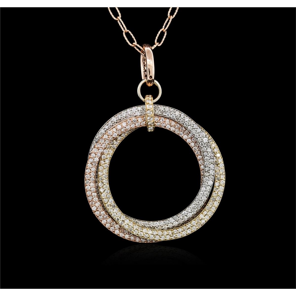 One electronically tested 14KT rose, yellow and white gold ladies combination cast & assembled diamond pendant & chain 18.0" long, figaro link with a lobster claw clasp with a bright polish finish. Identified with markings of "K14". Condition is new. Containing: Four Hundred Eight prong set round brilliant cut diamonds, measuring 1.00 - 1.00 x 0.60mm (depth est.) approximate total weight of 408 Stones = 1.47ct. Clarity: I-2 to I-3. Color: J - K. Eight prong set round brilliant cut diamonds, measuring 1.30 - 1.30 x 0.78mm (depth est.) approximate total weight of 8 Stones = 0.06ct. Clarity: I-2 to I-3. Color: I - J. All diamonds are graded in the mounting, unless otherwise stated. Total Weight of Diamonds 1.53ct. Total Weight of Pendant & Chain 15.70 grams. GGL Appraised at $8,975.00.