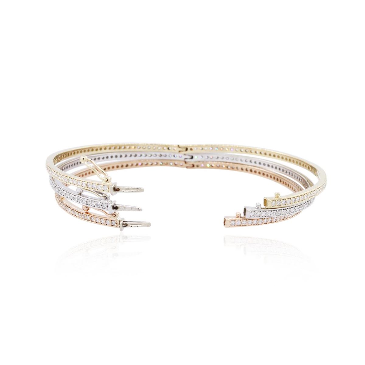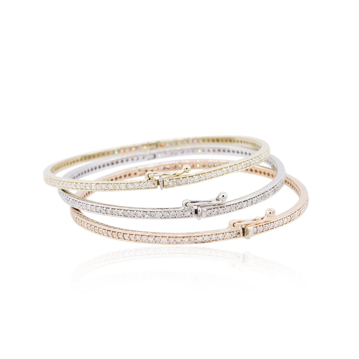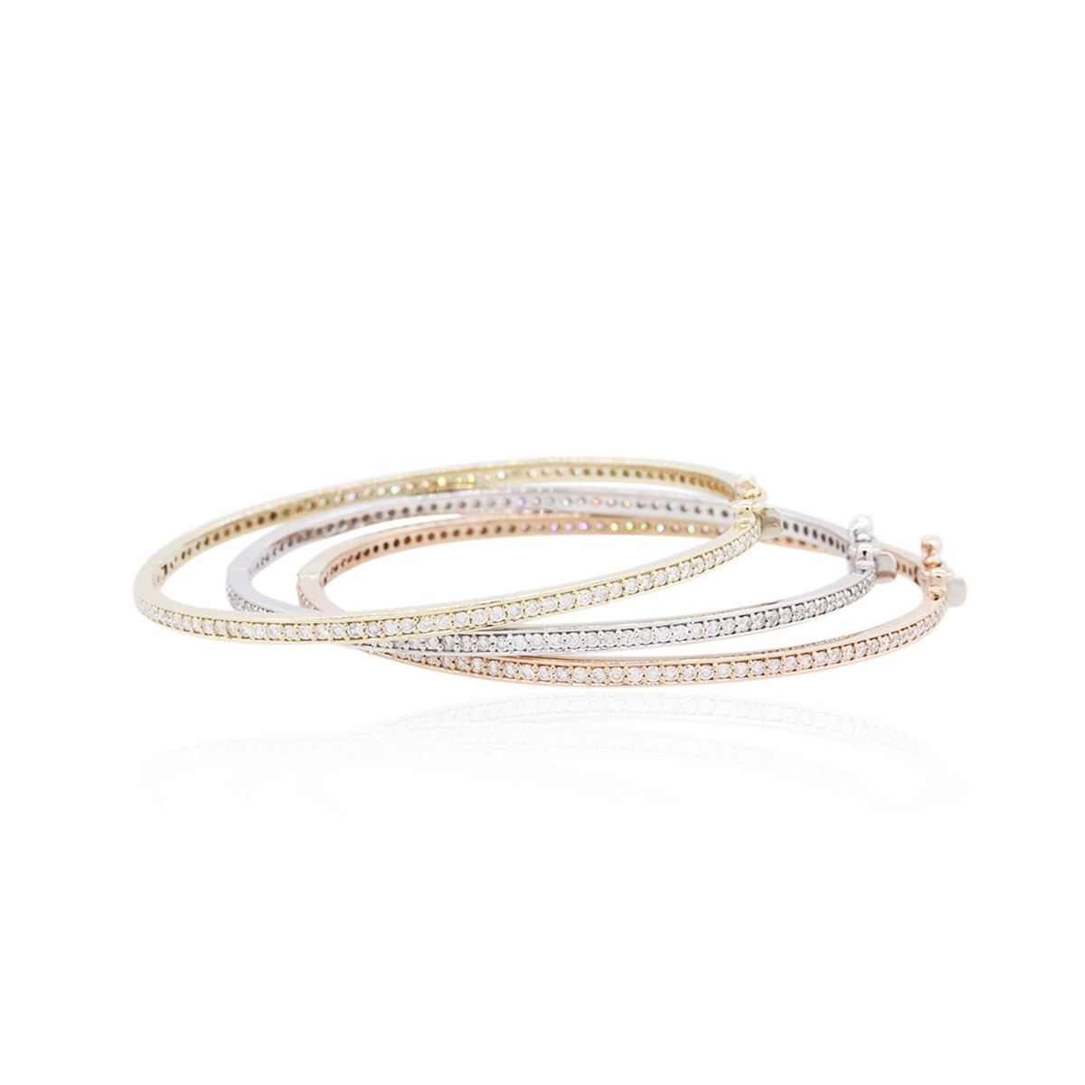 Three electronically tested 14KT yellow, white, and rose gold ladies cast diamond bangle bracelets with a hidden box clasp with safety closer with a bright polish finish. Condition is new. Inside diameter is 2-1/4 inches wide. Containing: Three hundred thirty prong set round brilliant cut diamonds, measuring 1.30 - 1.30 x 0.78mm (depth est.) approximate total weight of 330 Stones = 2.64ct. Clarity: SI-2 to I-2. Color: H - I, Cut is Good. All diamonds are graded in the mounting, unless otherwise stated. Total Weight of Diamonds 2.64ct. Total Weight of Bangle Bracelets 24.70 grams. GGL Appraised at $11,925.00.