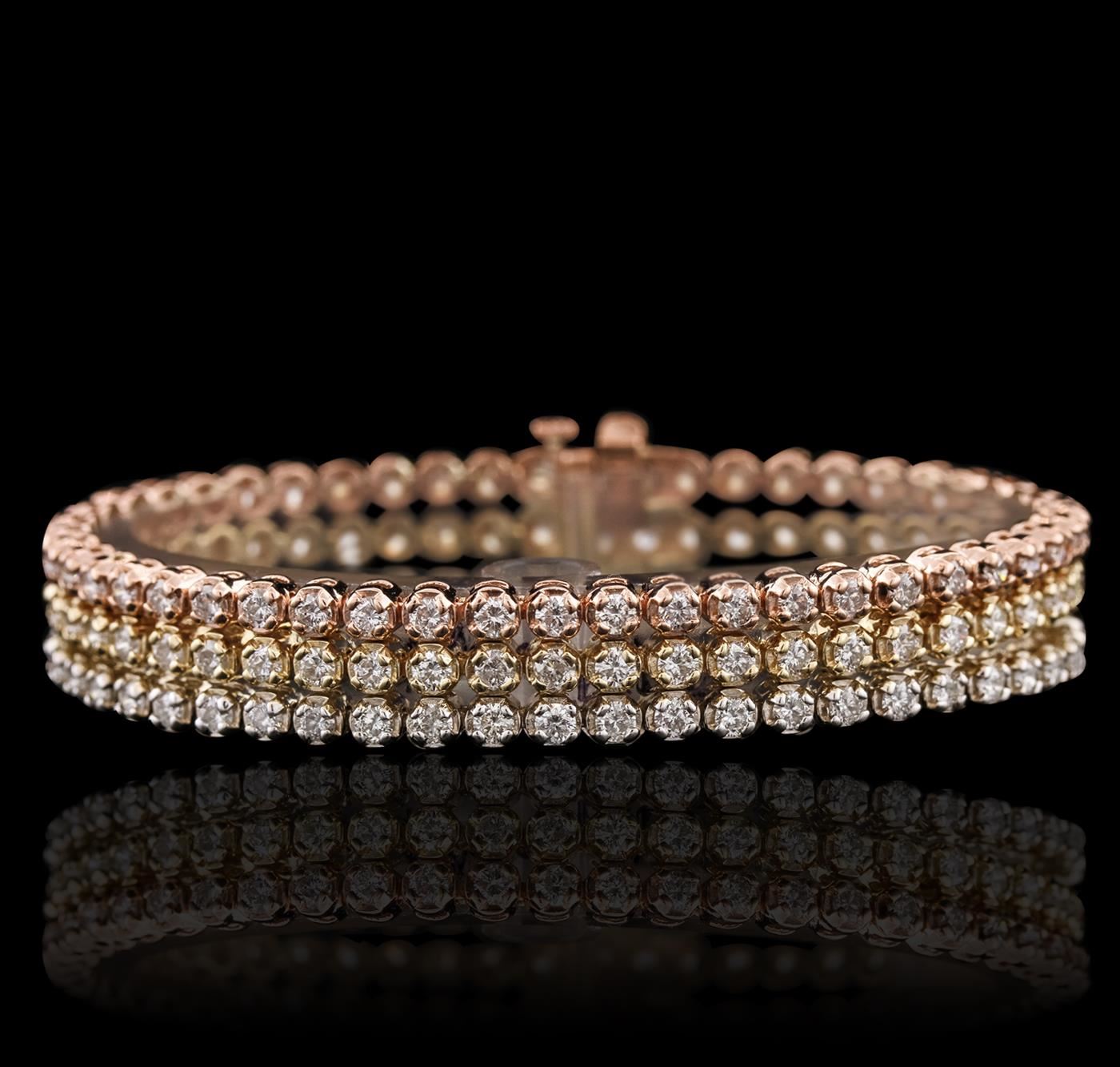 One electronically tested 14KT yellow, white, and rose gold ladies combination cast & assembled bracelet with a hidden box clasp with a bright polish finish. Measurements: 7" in length Identified with markings of "14K". Condition is new. Containing: One Hundred Forty-Seven prong set round brilliant cut diamonds, measuring 2.30 - 2.30 x 1.38mm (depth est.) approximate total weight of 147 Stones = 6.54ct. Clarity: SI-1 to I-1. Color: H - I, Cut is Good. All diamonds are graded in the mounting, unless otherwise stated. Total Weight of Diamonds 6.54ct. Total Weight of Bracelet 31.70 grams. GGL Appraised.