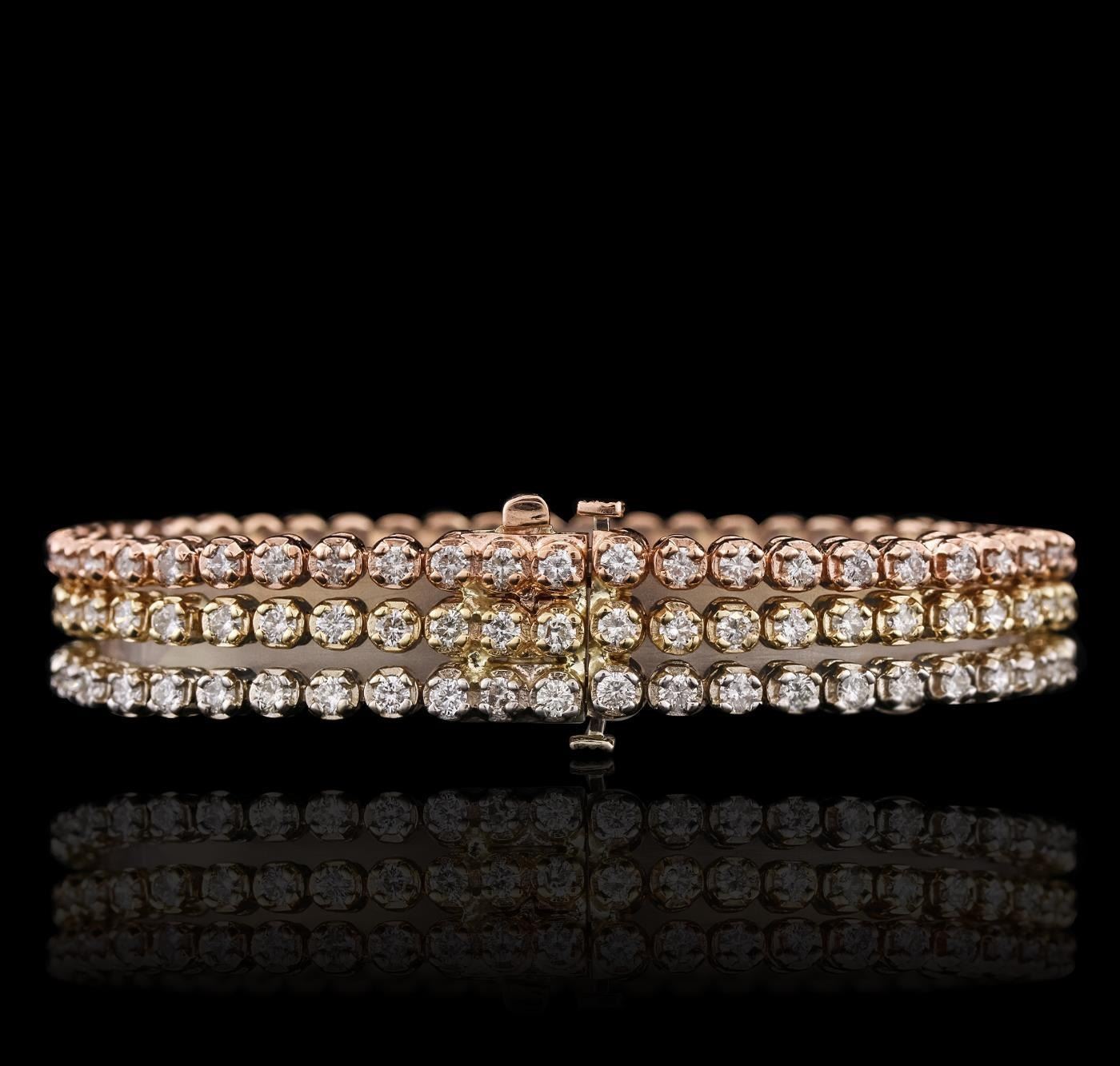 One electronically tested 14KT yellow, white, and rose gold ladies combination cast & assembled bracelet with a hidden box clasp with a bright polish finish. Measurements: 7" in length Identified with markings of "14K". Condition is new. Containing: One Hundred Forty-Seven prong set round brilliant cut diamonds, measuring 2.30 - 2.30 x 1.38mm (depth est.) approximate total weight of 147 Stones = 6.54ct. Clarity: SI-1 to I-1. Color: H - I, Cut is Good. All diamonds are graded in the mounting, unless otherwise stated. Total Weight of Diamonds 6.54ct. Total Weight of Bracelet 31.70 grams. GGL Appraised.