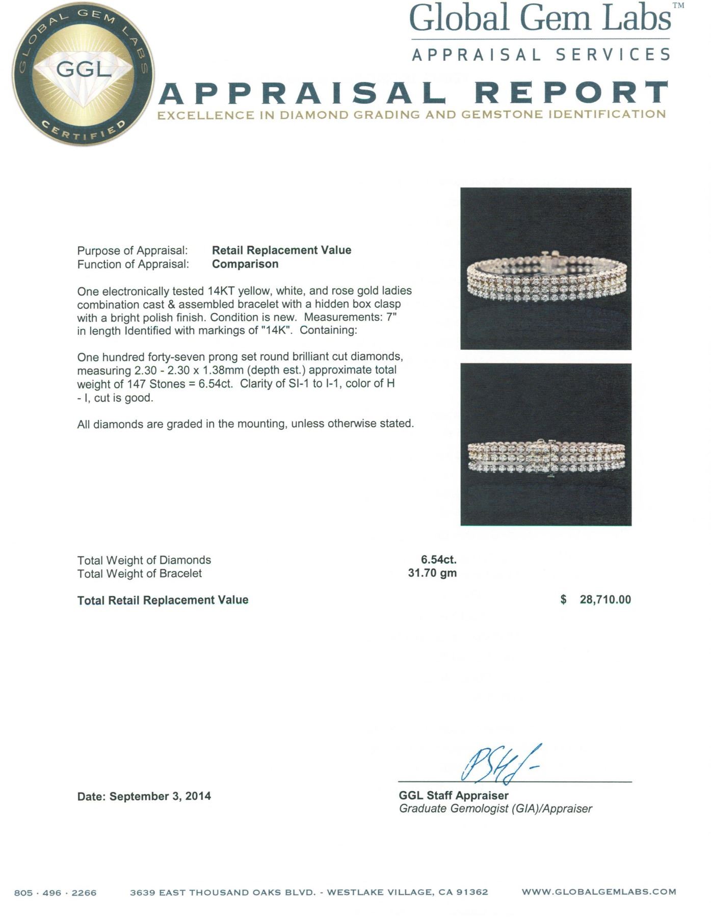 One electronically tested 14KT yellow, white, and rose gold ladies combination cast & assembled bracelet with a hidden box clasp with a bright polish finish. Measurements: 7" in length Identified with markings of "14K". Condition is new. Containing: One Hundred Forty-Seven prong set round brilliant cut diamonds, measuring 2.30 - 2.30 x 1.38mm (depth est.) approximate total weight of 147 Stones = 6.54ct. Clarity: SI-1 to I-1. Color: H - I, Cut is Good. All diamonds are graded in the mounting, unless otherwise stated. Total Weight of Diamonds 6.54ct. Total Weight of Bracelet 31.70 grams. GGL Appraised.