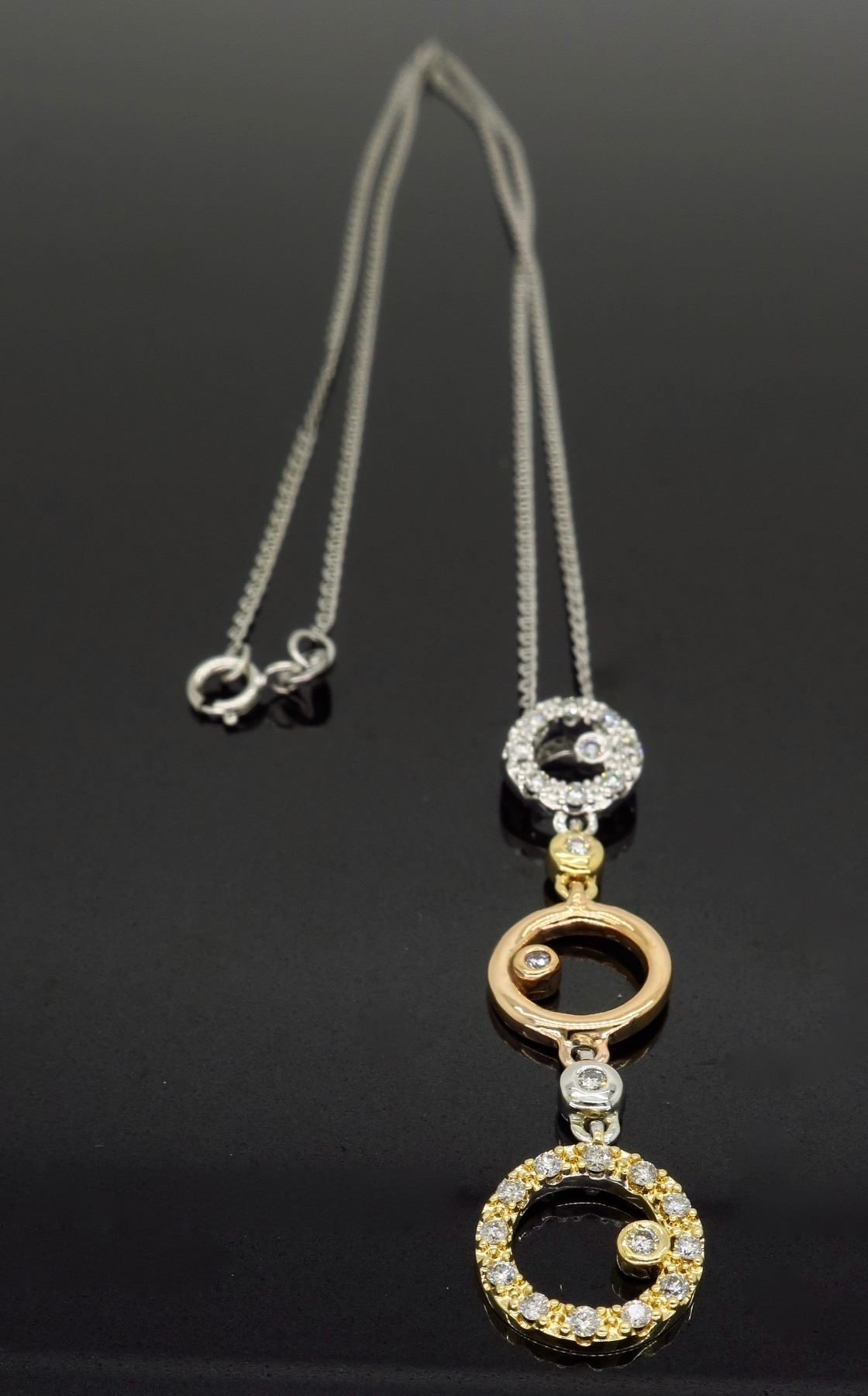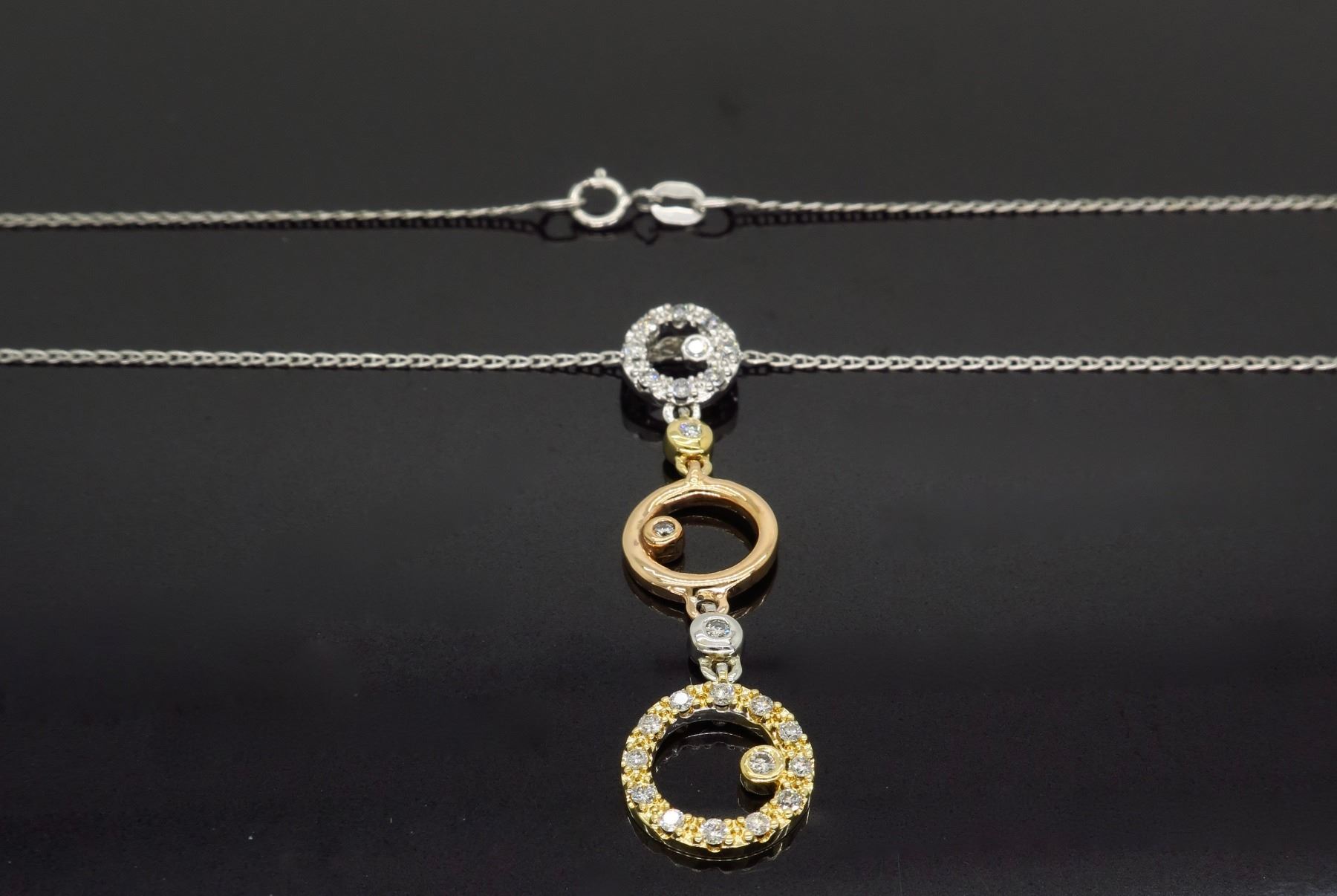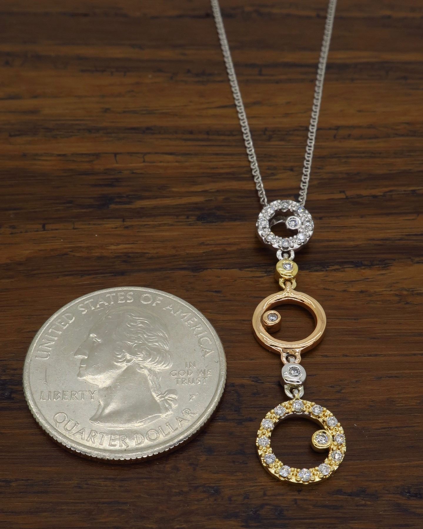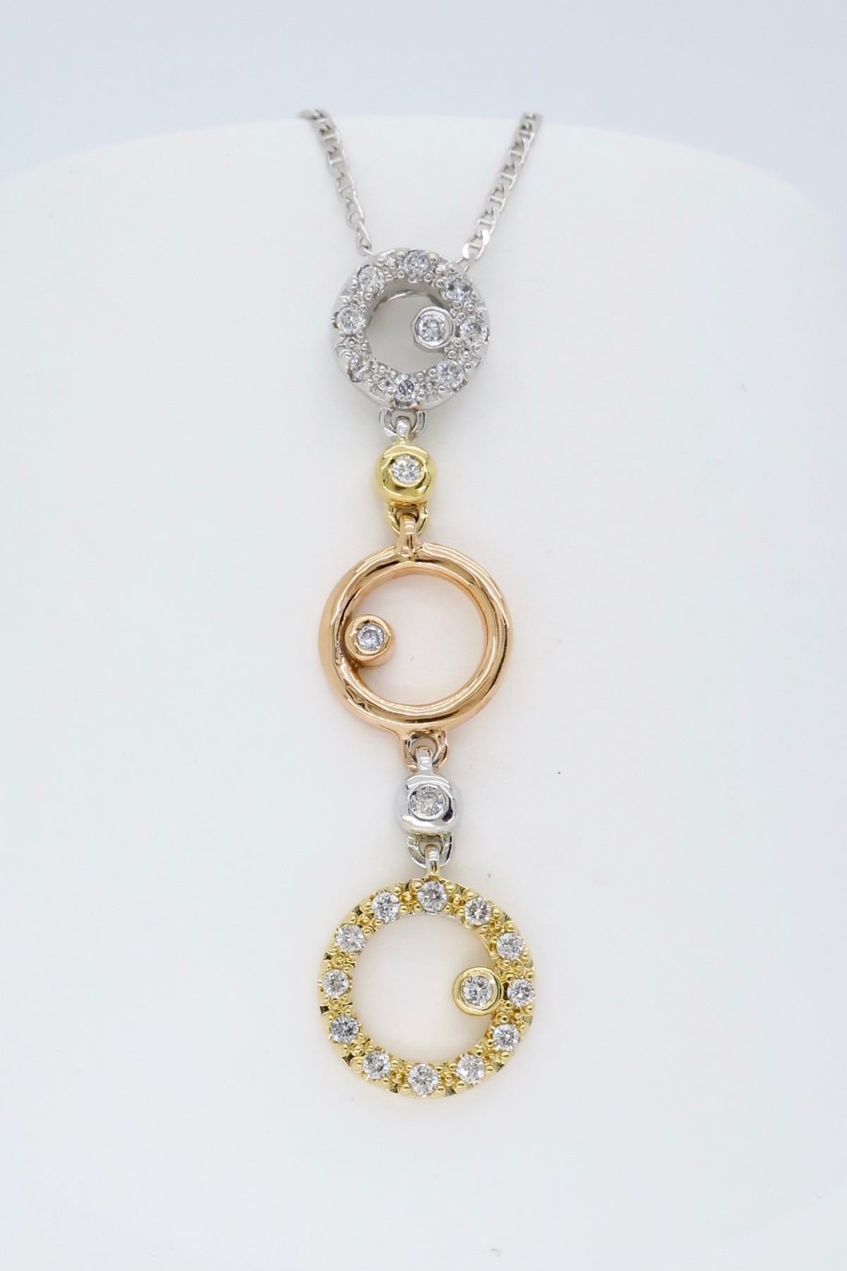 One 14KT Tri Color Gold 0.25ctw Diamond Pendant with Chain. (25) round Diamonds with a total weight of 0.25cts with a color of G-J and clarity of SI-1 to I-1. Total weight of this pendant is 3.6 grams. Total length of this chain is 16 inches. Total length of this pendant is 1.5 inches.