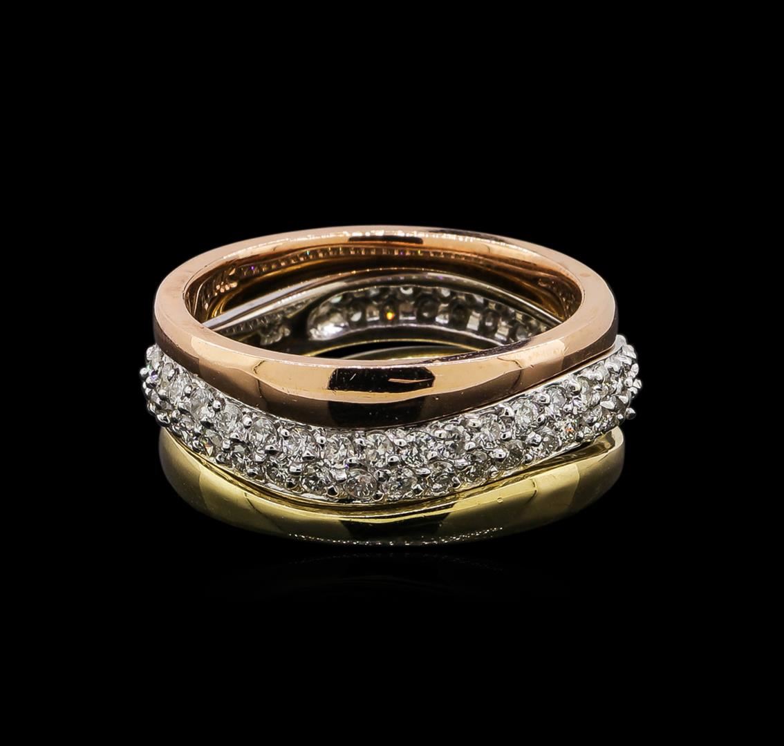 One electronically tested 14KT rose, yellow and white gold ladies cast diamond rings with a bright polish finish. Identified with markings of "14K". Condition is new. Containing: Sixty-One prong set round brilliant cut diamonds, measuring 1.30 - 1.30 x 0.78mm (depth est.) approximate total weight of 61 Stones = 0.49ct. Clarity: SI-2 to I-1. Color: H - I, Cut is Good. All diamonds are graded in the mounting, unless otherwise stated. Total Weight of Diamonds 0.49ct. Total Weight of Rings 8.40 grams. GGL Appraised at $4,100.00.