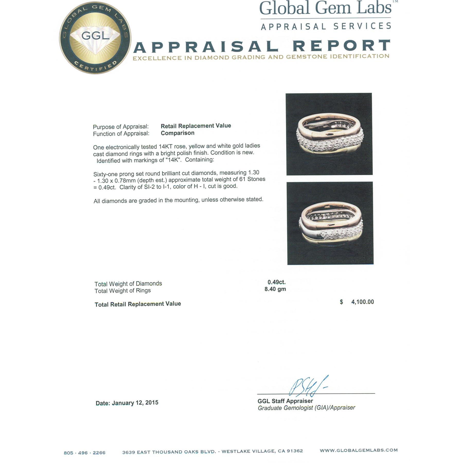 One electronically tested 14KT rose, yellow and white gold ladies cast diamond rings with a bright polish finish. Identified with markings of "14K". Condition is new. Containing: Sixty-One prong set round brilliant cut diamonds, measuring 1.30 - 1.30 x 0.78mm (depth est.) approximate total weight of 61 Stones = 0.49ct. Clarity: SI-2 to I-1. Color: H - I, Cut is Good. All diamonds are graded in the mounting, unless otherwise stated. Total Weight of Diamonds 0.49ct. Total Weight of Rings 8.40 grams. GGL Appraised at $4,100.00.
