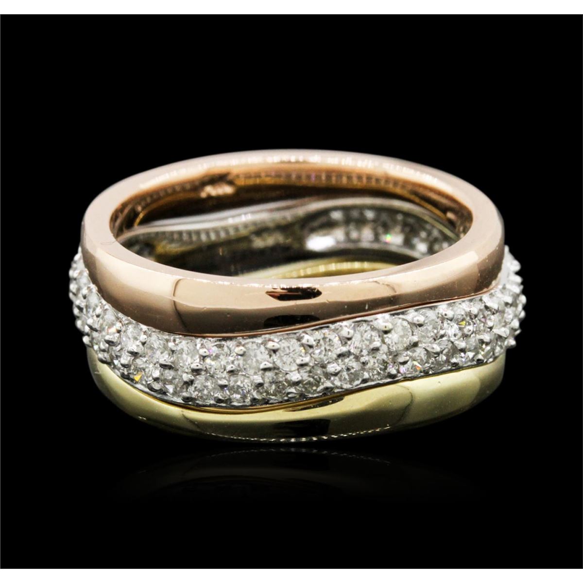 One electronically tested 14KT rose, yellow and white gold ladies cast diamond rings with a bright polish finish. Identified with markings of "14K". Condition is new. Containing: Sixty-One prong set round brilliant cut diamonds, measuring 1.30 - 1.30 x 0.78mm (depth est.) approximate total weight of 61 Stones = 0.49ct. Clarity: SI-2 to I-1. Color: H - I, Cut is Good. All diamonds are graded in the mounting, unless otherwise stated. Total Weight of Diamonds 0.49ct. Total Weight of Rings 8.40 grams. GGL Appraised at $4,100.00.