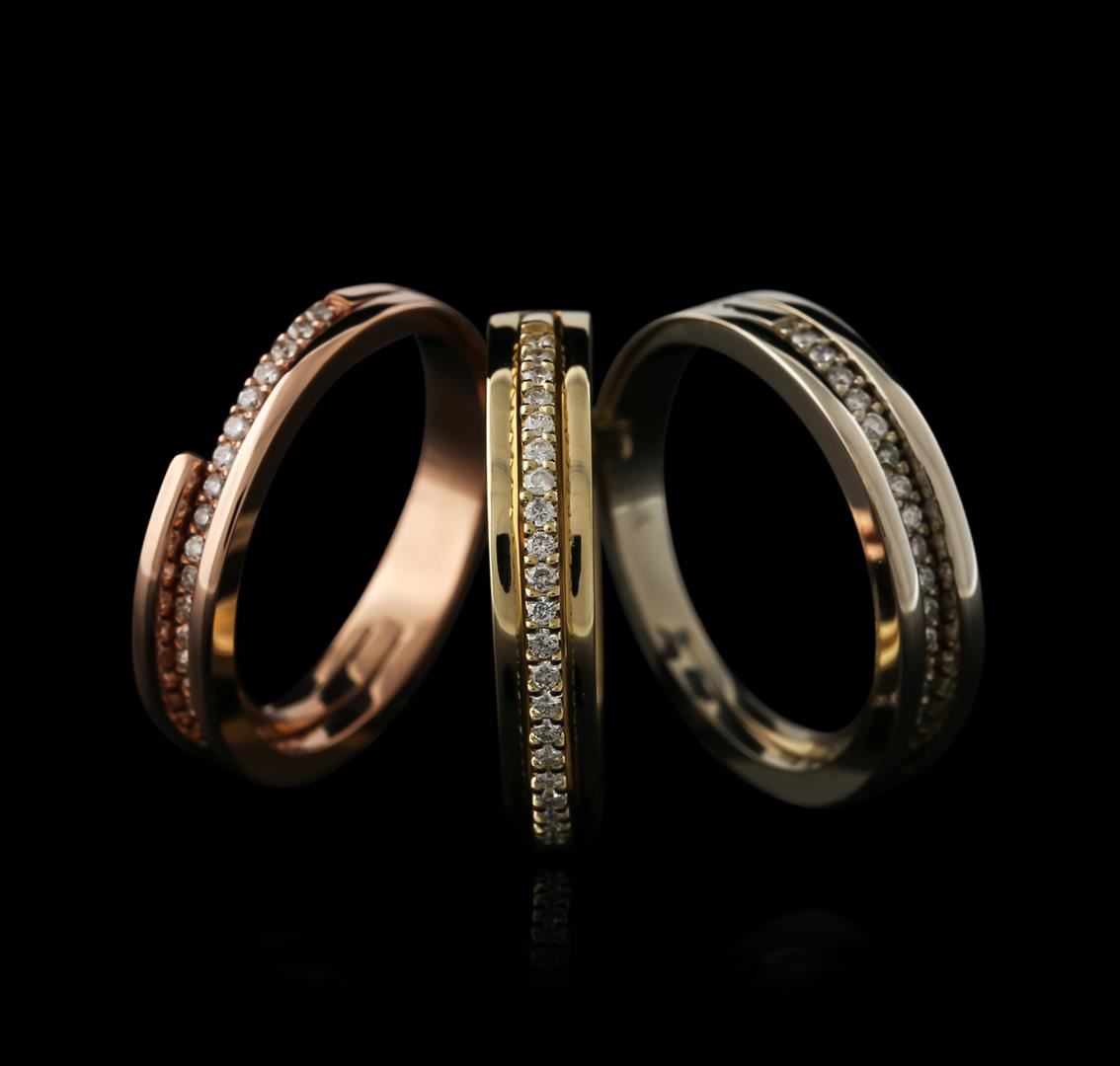 One electronically tested 14KT rose, yellow and white gold ladies cast diamond stacked ring with a bright polish finish. Identified with markings of "K14". Condition is new. Containing: Seventy-Five prong set round brilliant cut diamonds, measuring 1.20 x 1.20 x 0.76mm (depth est.) approximate total weight of 75 Stones = 0.50ct. Clarity: SI-2 to I-2. Color: I - J, Cut is Good. Diamonds are graded in the mounting, unless otherwise stated. Total Weight of Diamonds 0.50ct. Total Weight of Stacked Ring 12.20 grams. GGL Appraised at $3,385.00.