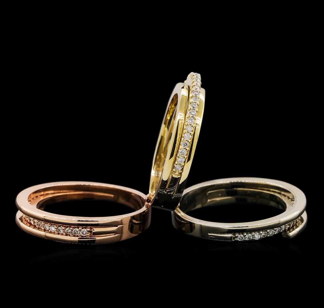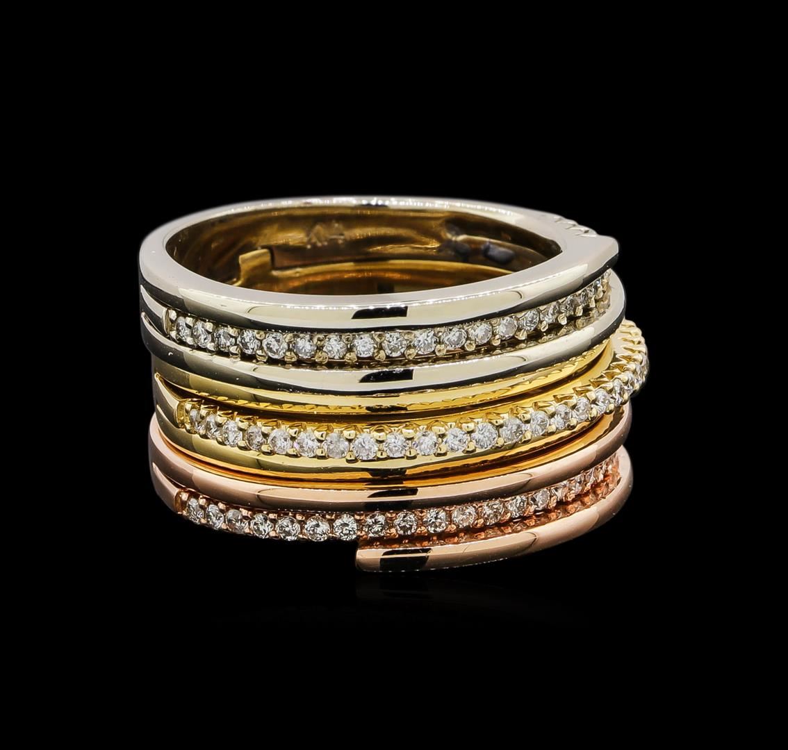 One electronically tested 14KT rose, yellow and white gold ladies cast diamond stacked ring with a bright polish finish. Identified with markings of "K14". Condition is new. Containing: Seventy-Five prong set round brilliant cut diamonds, measuring 1.20 x 1.20 x 0.76mm (depth est.) approximate total weight of 75 Stones = 0.50ct. Clarity: SI-2 to I-2. Color: I - J, Cut is Good. Diamonds are graded in the mounting, unless otherwise stated. Total Weight of Diamonds 0.50ct. Total Weight of Stacked Ring 12.20 grams. GGL Appraised at $3,385.00.