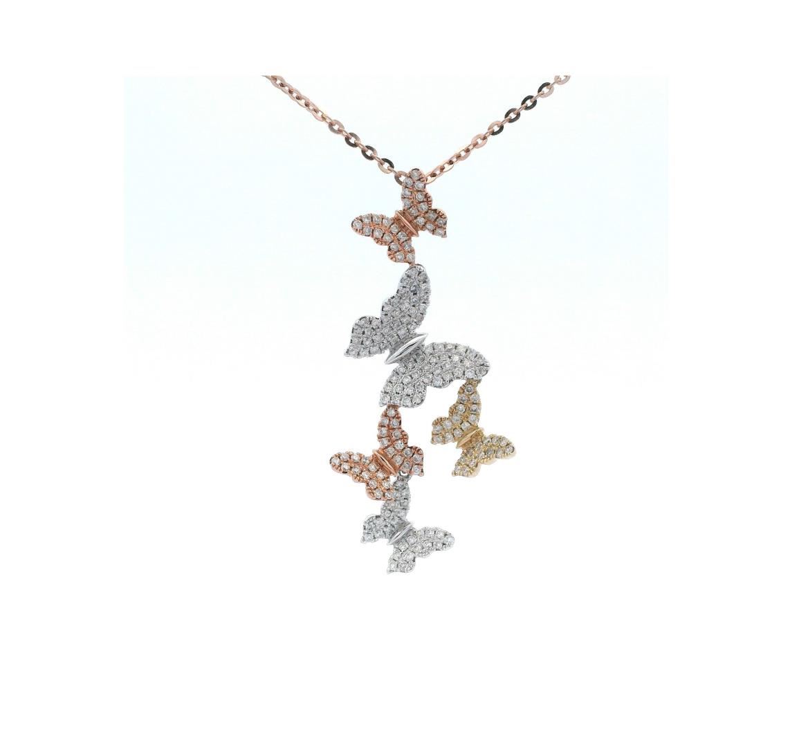 One electronically tested 14KT rose, white and yellow gold lady's combination cast & assembled fashion butterfly pendant and chain 18.0" long, 1.3mm diamond cut cable link with a lobster claw clasp with a five floating butterfly motif with a bright polish GAS Appraised.
