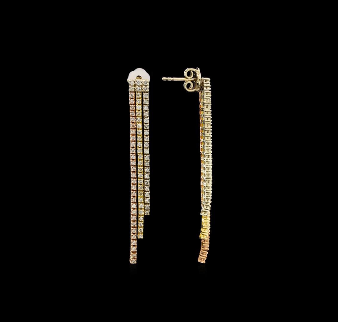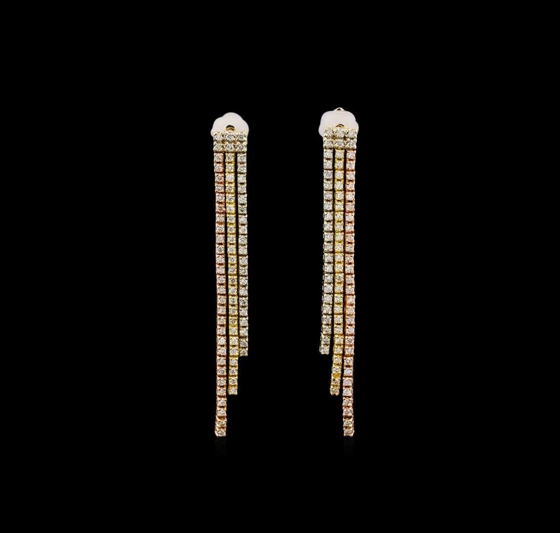 One pair electronically tested 14KT rose, yellow and white gold ladies cast diamond earrings with friction posts with a bright polish finish. Identified with markings of "14K". Condition is new. Containing: One Hundred Fifty-Six prong set round brilliant cut diamonds, measuring 1.10 - 1.10 x 0.66mm (depth est.) approximate total weight of 156 Stones = 0.75ct. Clarity: I-1 to I-2. Color: J - K, Cut is Good. All diamonds are graded in the mounting, unless otherwise stated. Total Weight of Diamonds 0.75ct. Total Weight of Earrings 7.80 grams. GGL Appraised at $3,325.00.