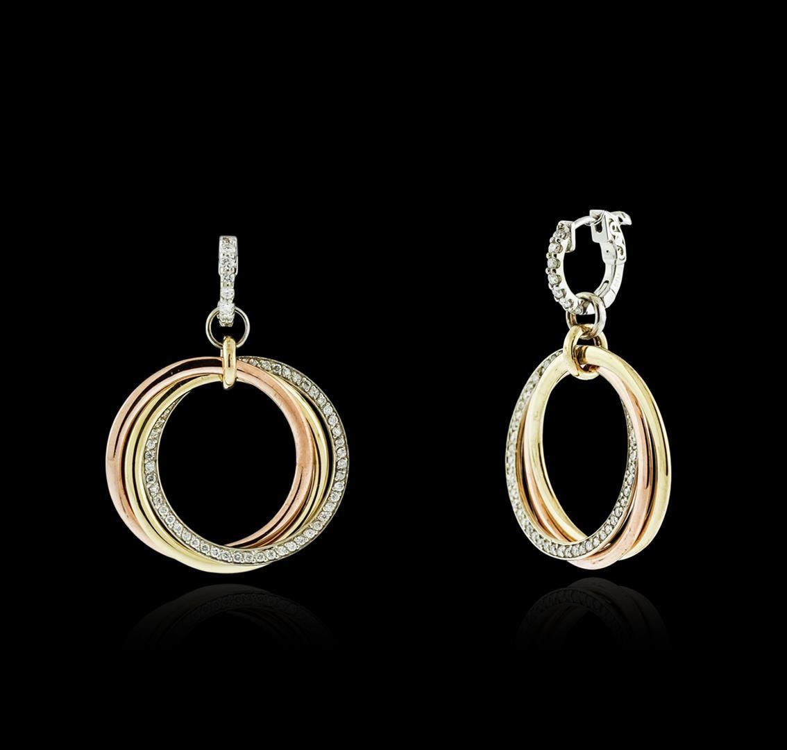 One pair electronically tested 14KT rose, yellow and white gold ladies cast diamond earrings with hinged clip backs with a bright polish finish. Identified with markings of "K14". Condition is new. Containing: One Hundred Twelve prong set round brilliant cut diamonds, measuring 1.30 - 1.30 x 0.78mm (depth est.) approximate total weight of 112 Stones = 0.90ct. Clarity: SI-2 to I-1. Color: I - J, Cut is Good. All diamonds are graded in the mounting, unless otherwise stated. Total Weight of Diamonds 0.90ct. Total Weight of Earrings 18.00 grams. GGL Appraised at $6,070.00.