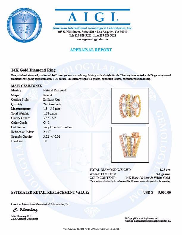 One 14KT Tri Color Gold 1.28ctw Diamond Ring. (24) Diamonds with a total weight of 1.28cts with a color of G-I and clarity of VS-2 to SI-3. Total weight of this ring is 9.1 grams.