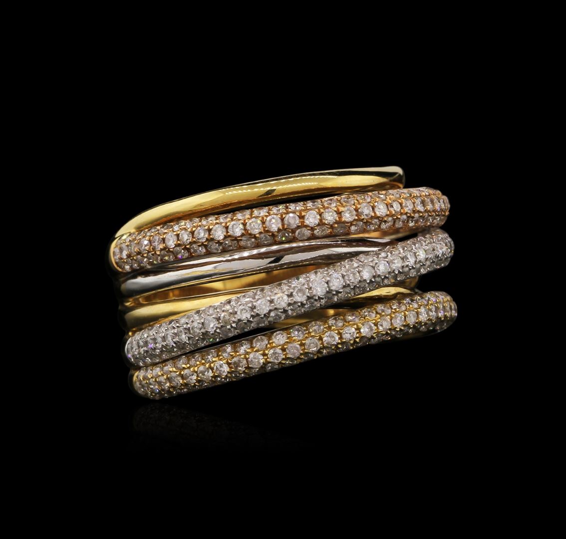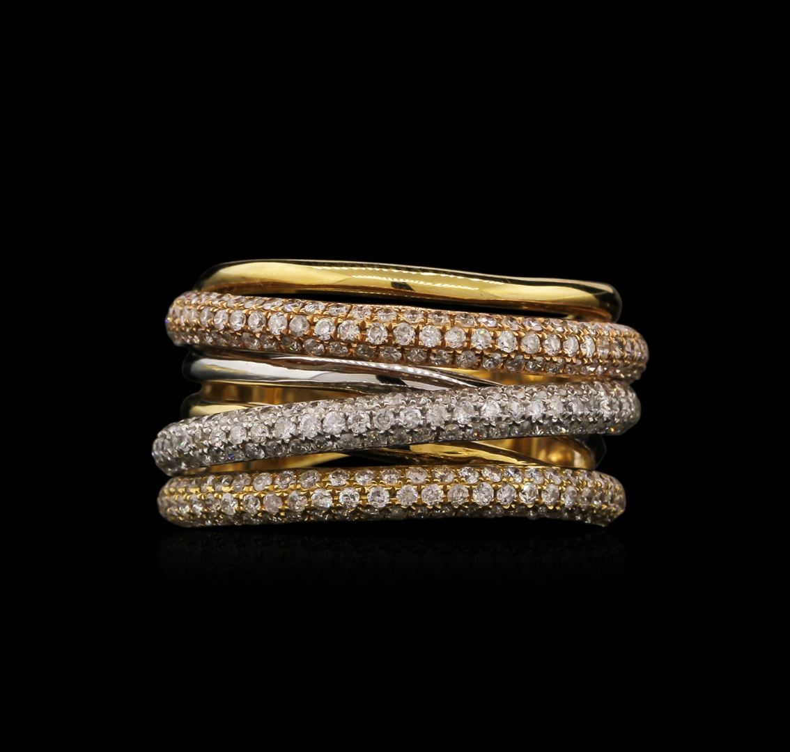 One electronically tested 14KT yellow, white, and rose gold ladies cast diamond ring with a bright polish finish. Identified with markings of "14K". Condition is new. Containing: Two Hundred Ninety-Seven prong set round brilliant cut diamonds, measuring 1.10 - 1.10 x 0.66mm (depth est.) approximate total weight of 297 Stones = 1.95ct. Clarity: I-1 to I-2. Color: I - J, Cut is Good. Diamonds are graded in the mounting, unless otherwise stated. Total Weight of Diamonds 1.95ct. Total Weight of Ring 9.30 grams. GGL Appraised at $3,910.00.