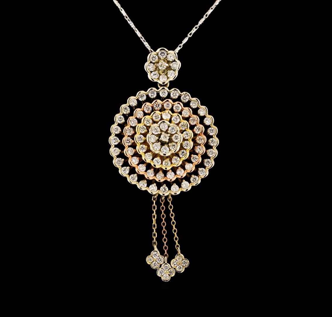 One electronically tested 14KT tri-color gold ladies cast & assembled diamond pendant with chain. The pendant features independently moving diamond bezels with three diamond dangle accents, completed by a diamond set bail. The pendant is supported by an eighteen inch length 14KT white gold designer style chain, terminating in a lobster claw clasp. Bright polish finish. Identified with markings of 14K. Condition is new, good workmanship. Containing: Eighty-Three half bezel and prong set round brilliant cut diamonds, measuring 1.80 - 1.80 x 1.08mm (depth est.) approximate total weight of 83 Stones = 1.86ct. Graded in the setting. Clarity: VS-2 to SI-2. Color: G - I Twelve half bezel set round brilliant cut diamonds, measuring 1.50 - 1.40 x 0.87mm (depth est.) approximate total weight of 12 Stones = 0.23ct. Graded in the setting. Clarity: SI-1 to SI-2. Color: G - I. Total Weight of Diamonds 2.09ct. Total Weight of Pendant With Chain 10.85 grams. AIG Appraised at $8,975.00.