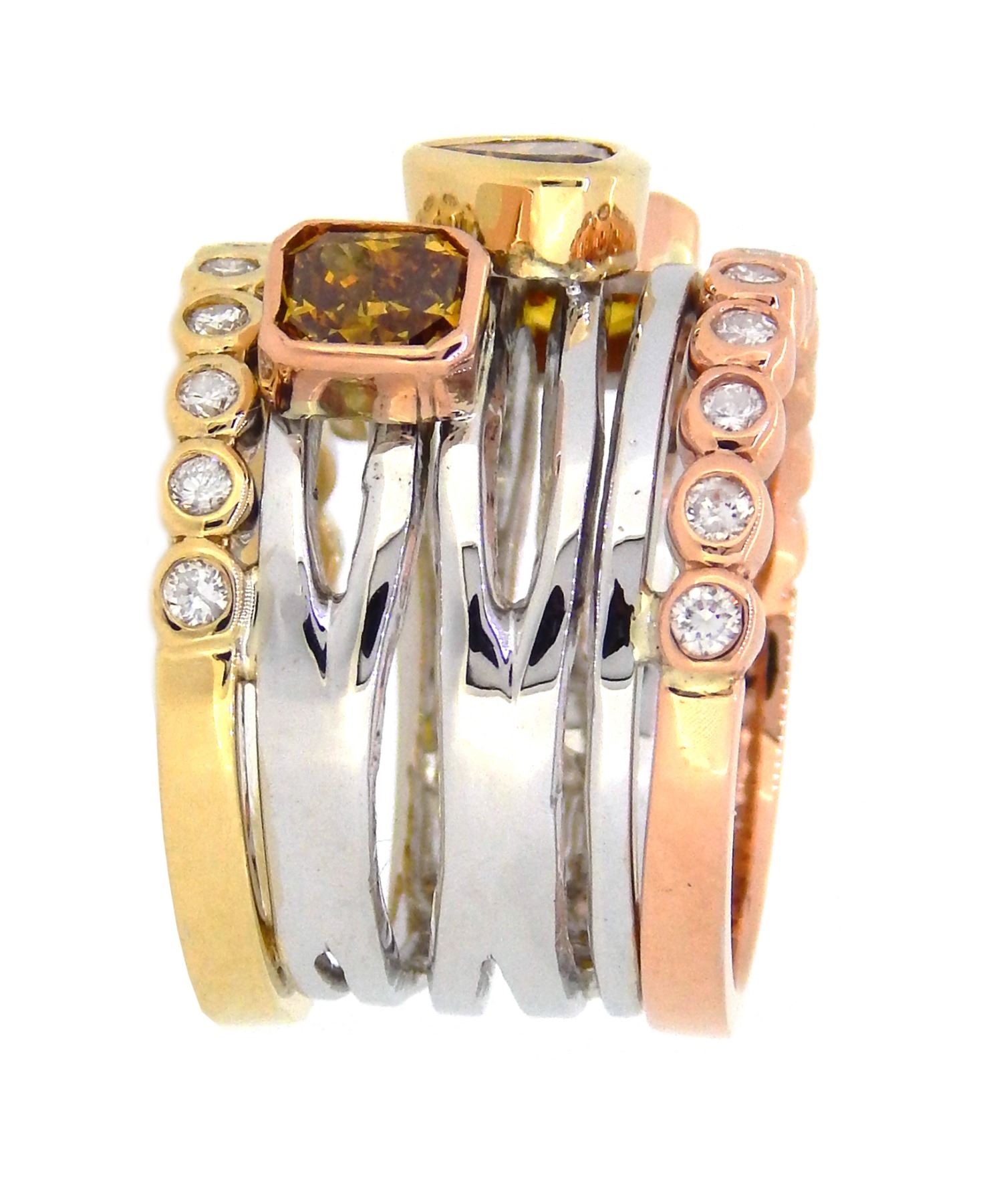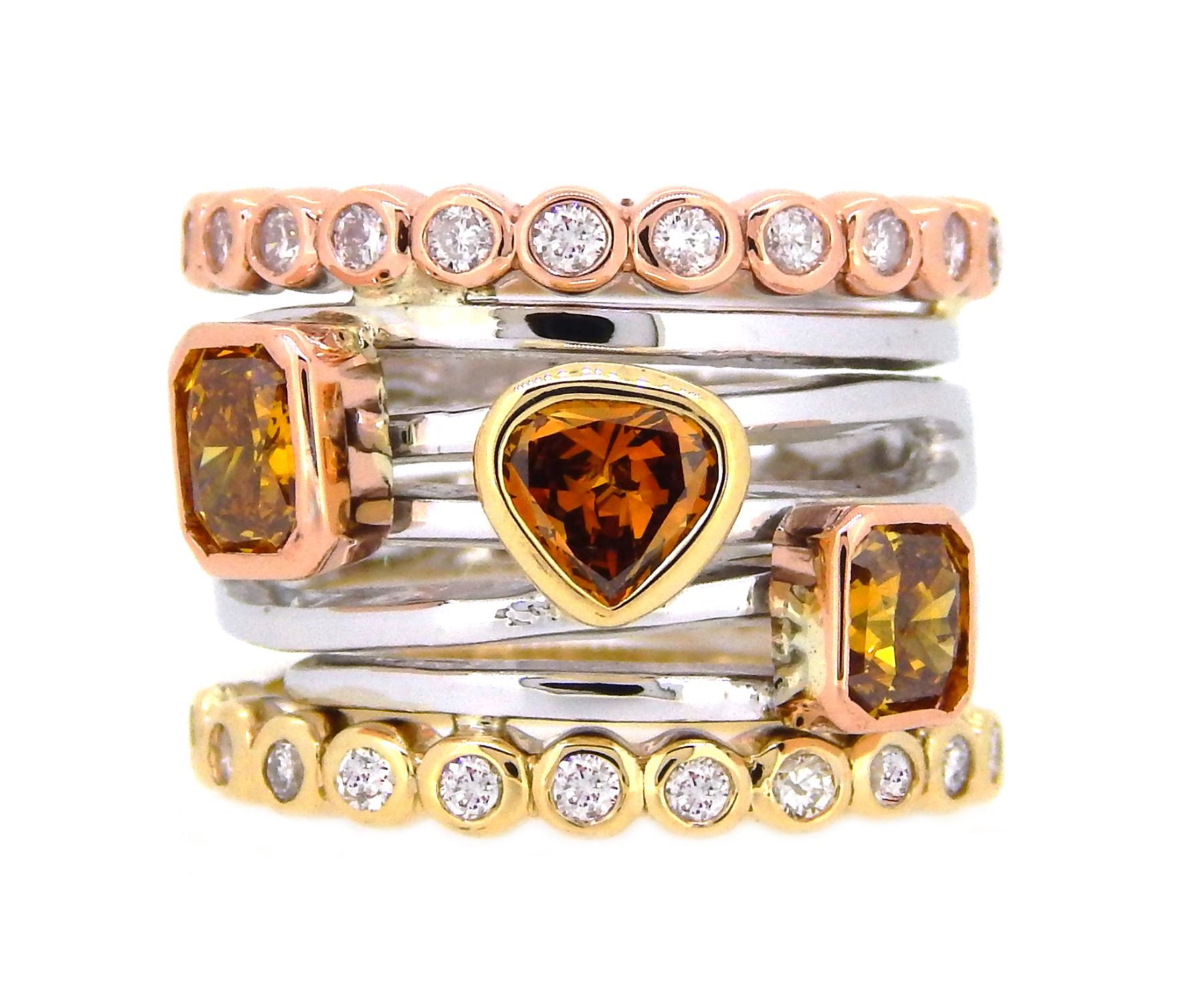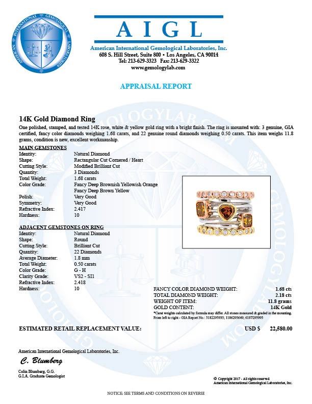 One 14KT Tri Color Gold 2.18ctw Fancy Diamond Ring. (3) Fancy Diamonds with a total weight of 1.68cts with a color of Fancy Deep Brownish Yellowish Orange and Fancy Deep Brown Yellow. (22) Diamonds with a total weight of 0.50cts. Total weight of this ring is 11.8 grams.