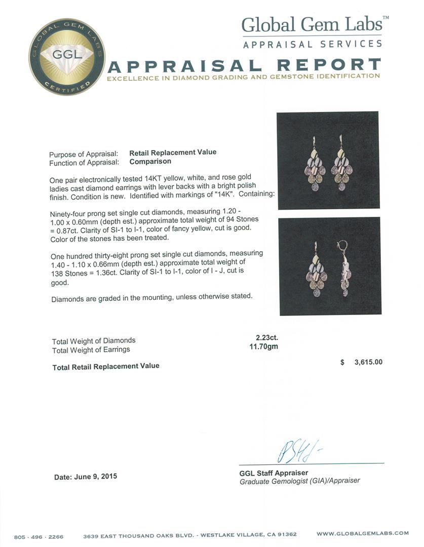 One pair electronically tested 14KT yellow, white, and rose gold ladies cast diamond earrings with lever backs with a bright polish finish. Identified with markings of "14K". Condition is new. Containing: Ninety-Four prong set single cut diamonds, measuring 1.20 - 1.00 x 0.60mm (depth est.) approximate total weight of 94 Stones = 0.87ct. Clarity: SI-1 to I-1, Cut is Good. Color of the stones has been treated. One Hundred Thirty-Eight prong set single cut diamonds, measuring 1.40 - 1.10 x 0.66mm (depth est.) approximate total weight of 138 Stones = 1.36ct. Clarity: SI-1 to I-1. Color: I - J, Cut is Good. Diamonds are graded in the mounting, unless otherwise stated. Total Weight of Diamonds 2.23ct. Total Weight of Earrings 11.70 grams. GGL Appraised at $3,615.00.
