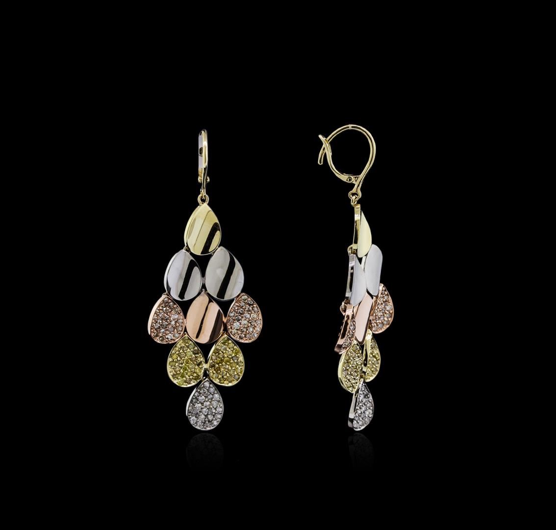 One pair electronically tested 14KT yellow, white, and rose gold ladies cast diamond earrings with lever backs with a bright polish finish. Identified with markings of "14K". Condition is new. Containing: Ninety-Four prong set single cut diamonds, measuring 1.20 - 1.00 x 0.60mm (depth est.) approximate total weight of 94 Stones = 0.87ct. Clarity: SI-1 to I-1, Cut is Good. Color of the stones has been treated. One Hundred Thirty-Eight prong set single cut diamonds, measuring 1.40 - 1.10 x 0.66mm (depth est.) approximate total weight of 138 Stones = 1.36ct. Clarity: SI-1 to I-1. Color: I - J, Cut is Good. Diamonds are graded in the mounting, unless otherwise stated. Total Weight of Diamonds 2.23ct. Total Weight of Earrings 11.70 grams. GGL Appraised at $3,615.00.