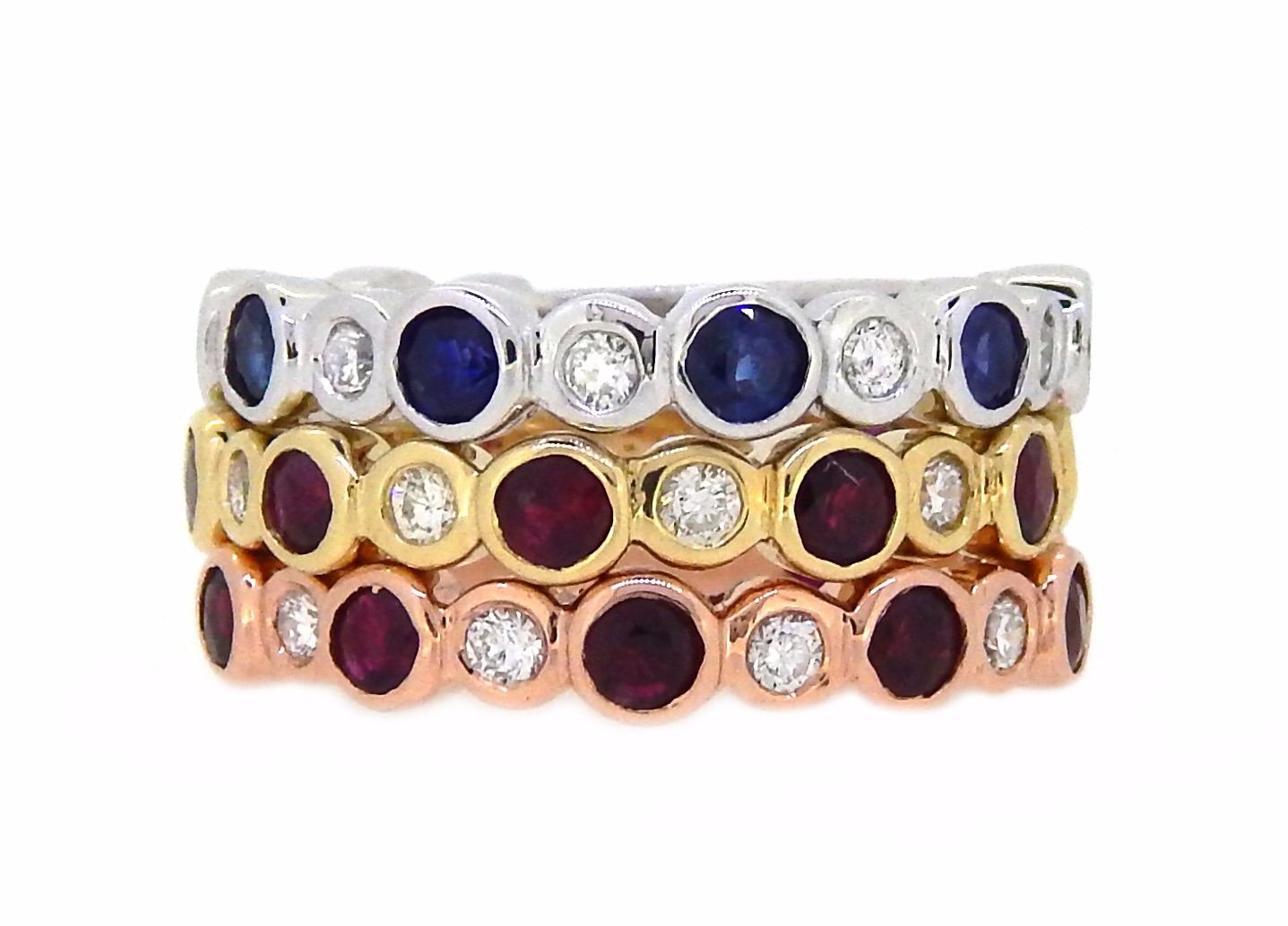 One 14KT Tri Color Gold 2.51ctw Ruby, Blue Sapphire and Diamond Ring. (14) Rubies with a total weight of 1.56cts. (7) Blue Sapphires with a total weight of 0.95cts. (21) Diamonds with a total weight of 0.67cts with a color of G-H and clarity of VS-2 to SI-1. Total weight of these rings are 7.7 grams.