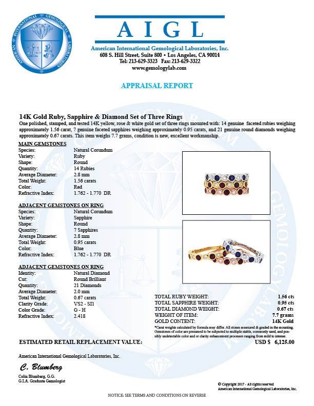One 14KT Tri Color Gold 2.51ctw Ruby, Blue Sapphire and Diamond Ring. (14) Rubies with a total weight of 1.56cts. (7) Blue Sapphires with a total weight of 0.95cts. (21) Diamonds with a total weight of 0.67cts with a color of G-H and clarity of VS-2 to SI-1. Total weight of these rings are 7.7 grams.