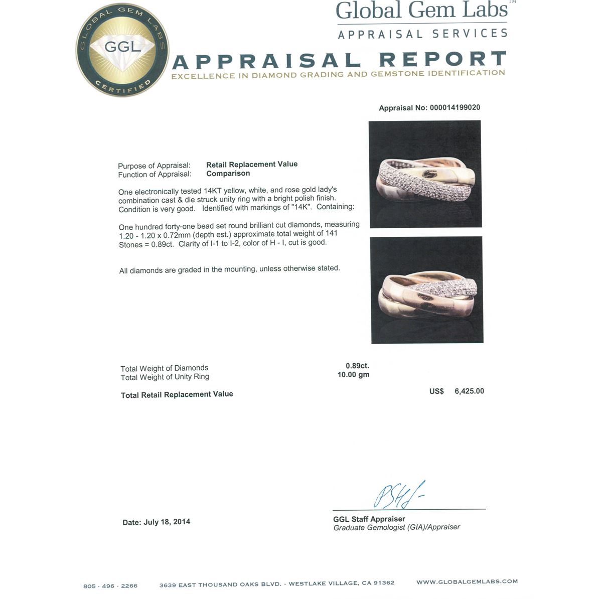 One electronically tested 14KT yellow, white, and rose gold Ladies combination cast & die struck unity ring with a bright polish finish. Condition is very good. Identified with markings of "14K". Containing: One Hundred Forty-One bead set round brilliant cut diamonds, measuring 1.20 - 1.20 x 0.72mm (depth est.) approximate. Total Weight of 141 Stones = 0.89ct. Clarity: I-1 to I-2. Color: H - I, Cut is Good. All diamonds are graded in the mounting, unless otherwise stated. Total Weight of Diamonds 0.89ct. Total Weight of Unity Ring 10.00 grams.. GGL Appraised at $6,425.00.