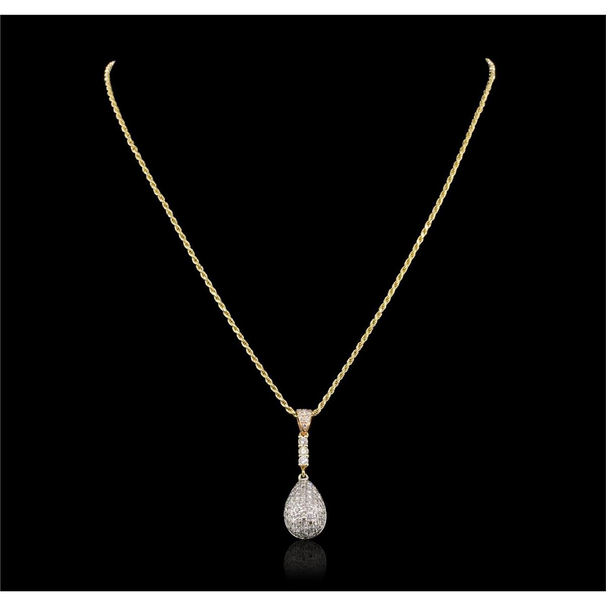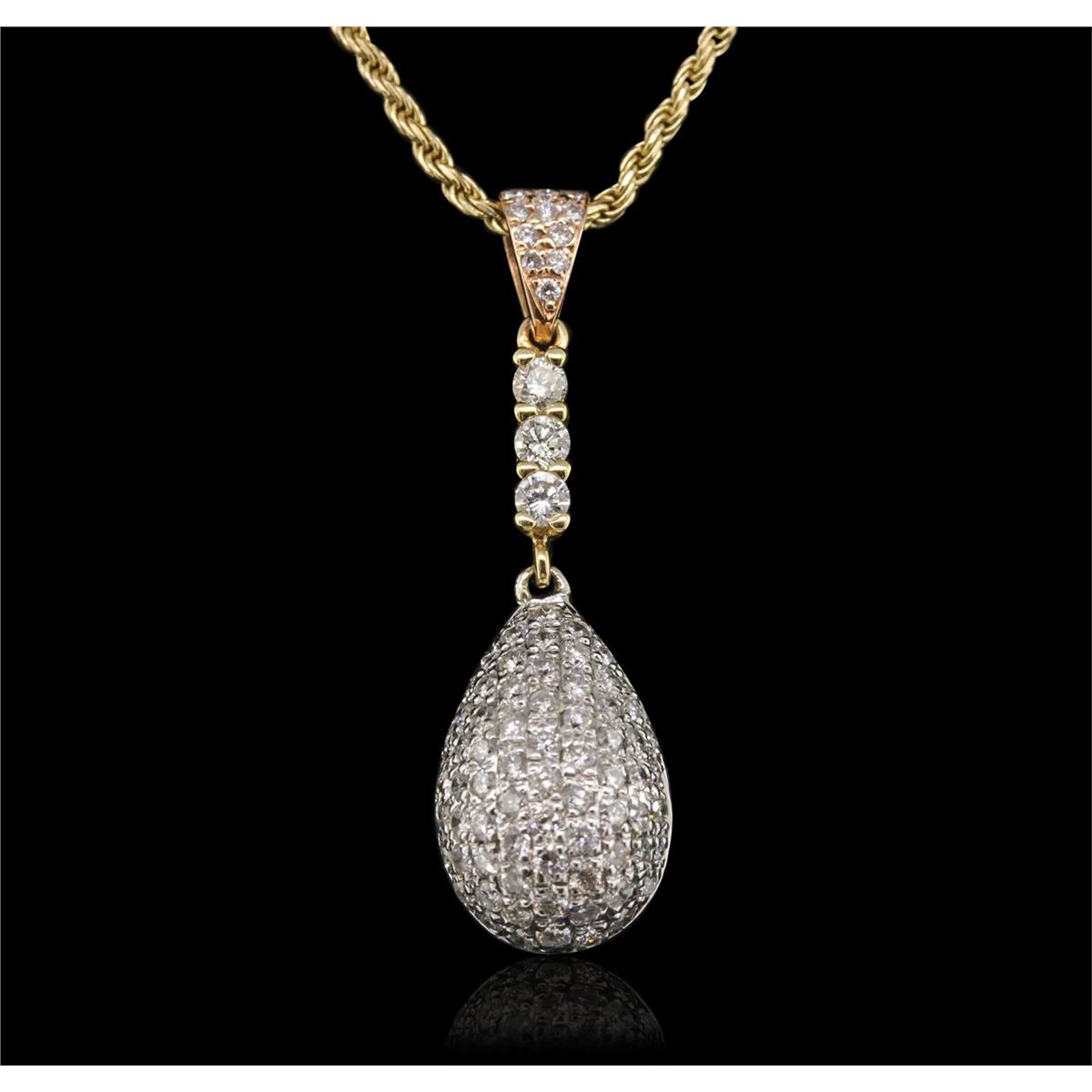 One electronically tested 14KT yellow, white, and rose gold ladies combination cast & assembled pendant & chain 15.0" long, medium cable link with a lobster claw clasp with a bright polish finish. Condition is new. Identified with markings of "14K". Containing: Three prong set round brilliant cut diamonds, measuring 2.40 - 2.40 x 1.44mm (depth est.) approximate. Total Weight of 3 Stones = 0.15ct. Clarity: SI-1. Color: G - H, Cut is Good. Ninety-Seven prong set round brilliant cut diamonds, measuring 1.40 - 1.20 x 0.78mm (depth est.) approximate. Total Weight of 97 Stones = 0.78ct. Clarity: SI-2 to I-1. Color: G - H, Cut is Good. All diamonds are graded in the mounting, unless otherwise stated. Total Weight of Diamonds 0.93ct. Total Weight of Pendant & Chain 7.10 grams. GGL Appraised at $5,690.00.