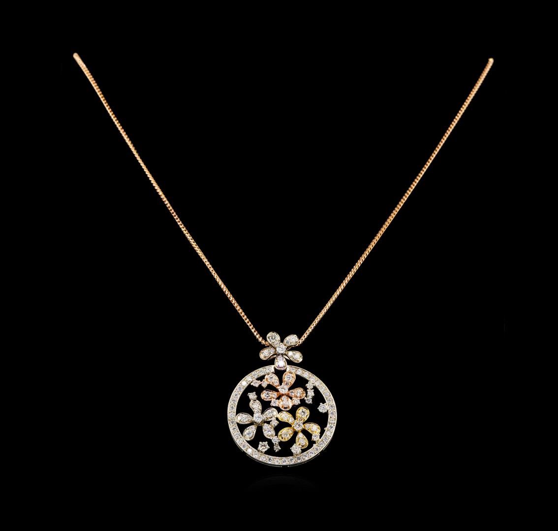 One electronically tested 14KT rose, yellow and white gold ladies combination cast & assembled diamond pendant & chain 18.0" long, small braided design wheat link with a lobster claw clasp with a bright polish finish. Identified with markings of "K14". Condition is new. Containing: Ninety-Nine prong set round brilliant cut diamonds, measuring 1.90 - 1.00 x 0.87mm (depth est.) exact total weight 99 Stones = 2.32ct. Clarity: SI-1 to I-1. Color: G - H, Cut is Good. All diamonds are graded in the mounting, unless otherwise stated. Total Weight of Diamonds 2.32ct. Total Weight of Pendant & Chain 10.80 grams. GGL Appraised at $5,800.00.