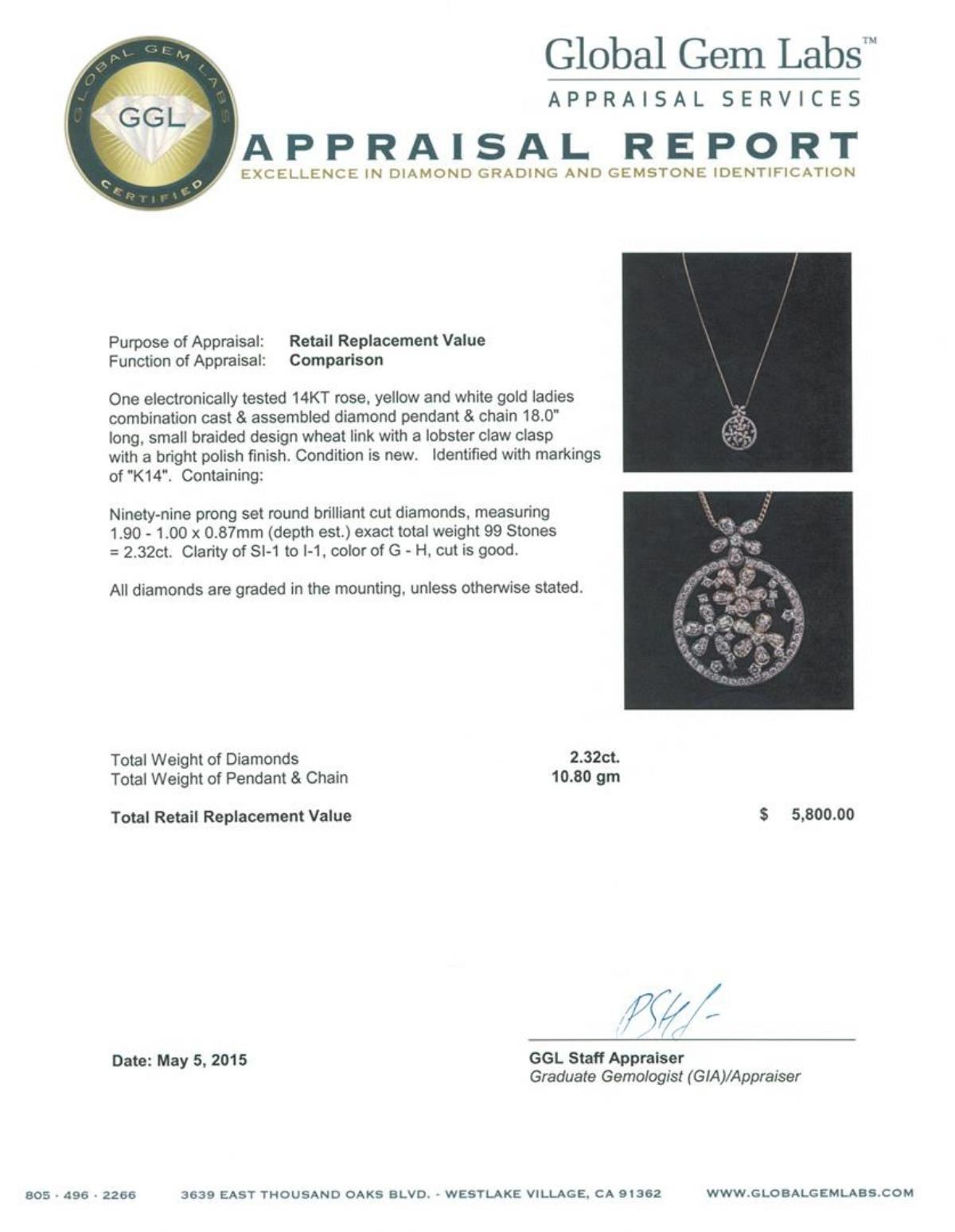 One electronically tested 14KT rose, yellow and white gold ladies combination cast & assembled diamond pendant & chain 18.0" long, small braided design wheat link with a lobster claw clasp with a bright polish finish. Identified with markings of "K14". Condition is new. Containing: Ninety-Nine prong set round brilliant cut diamonds, measuring 1.90 - 1.00 x 0.87mm (depth est.) exact total weight 99 Stones = 2.32ct. Clarity: SI-1 to I-1. Color: G - H, Cut is Good. All diamonds are graded in the mounting, unless otherwise stated. Total Weight of Diamonds 2.32ct. Total Weight of Pendant & Chain 10.80 grams. GGL Appraised.
