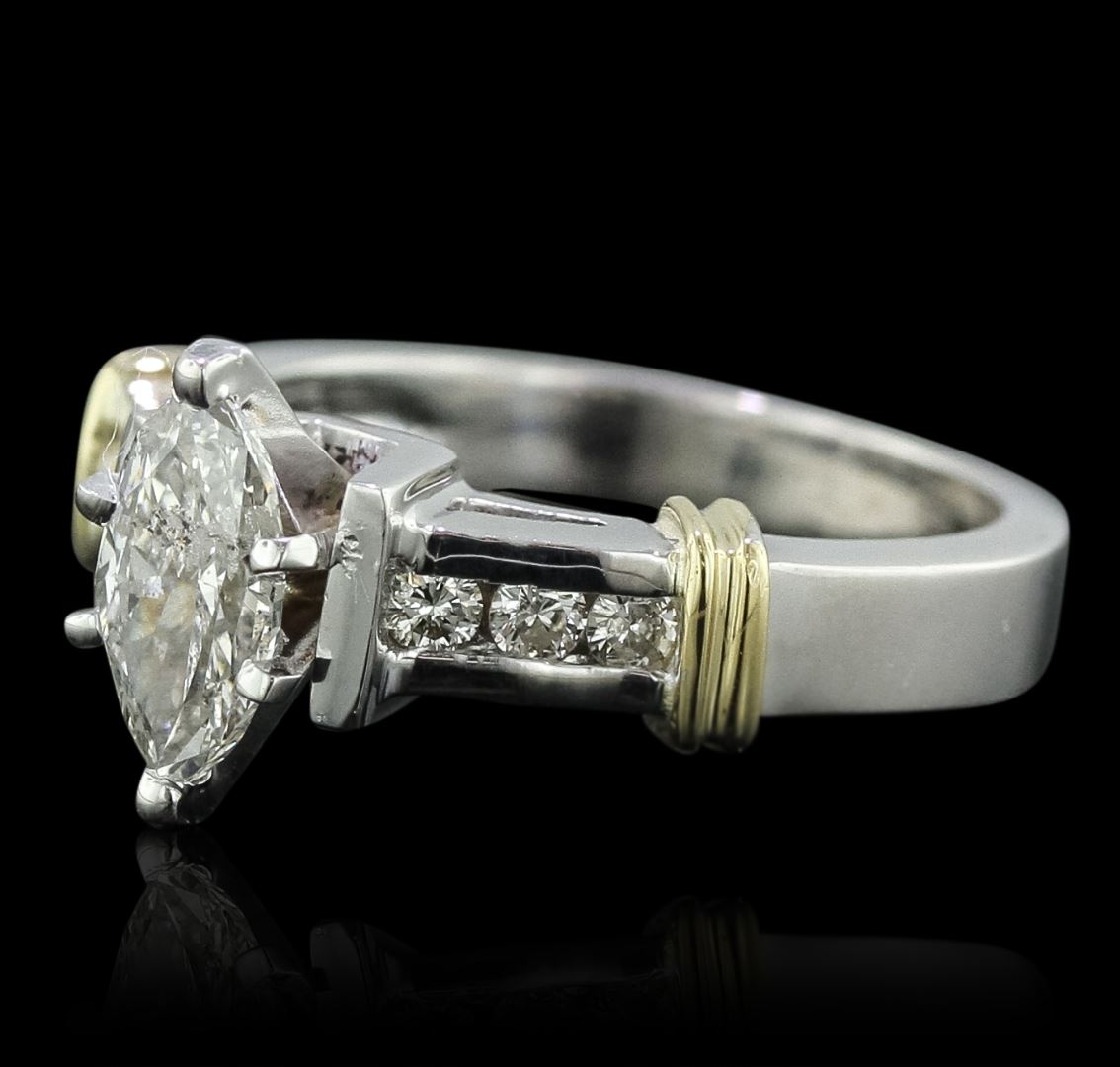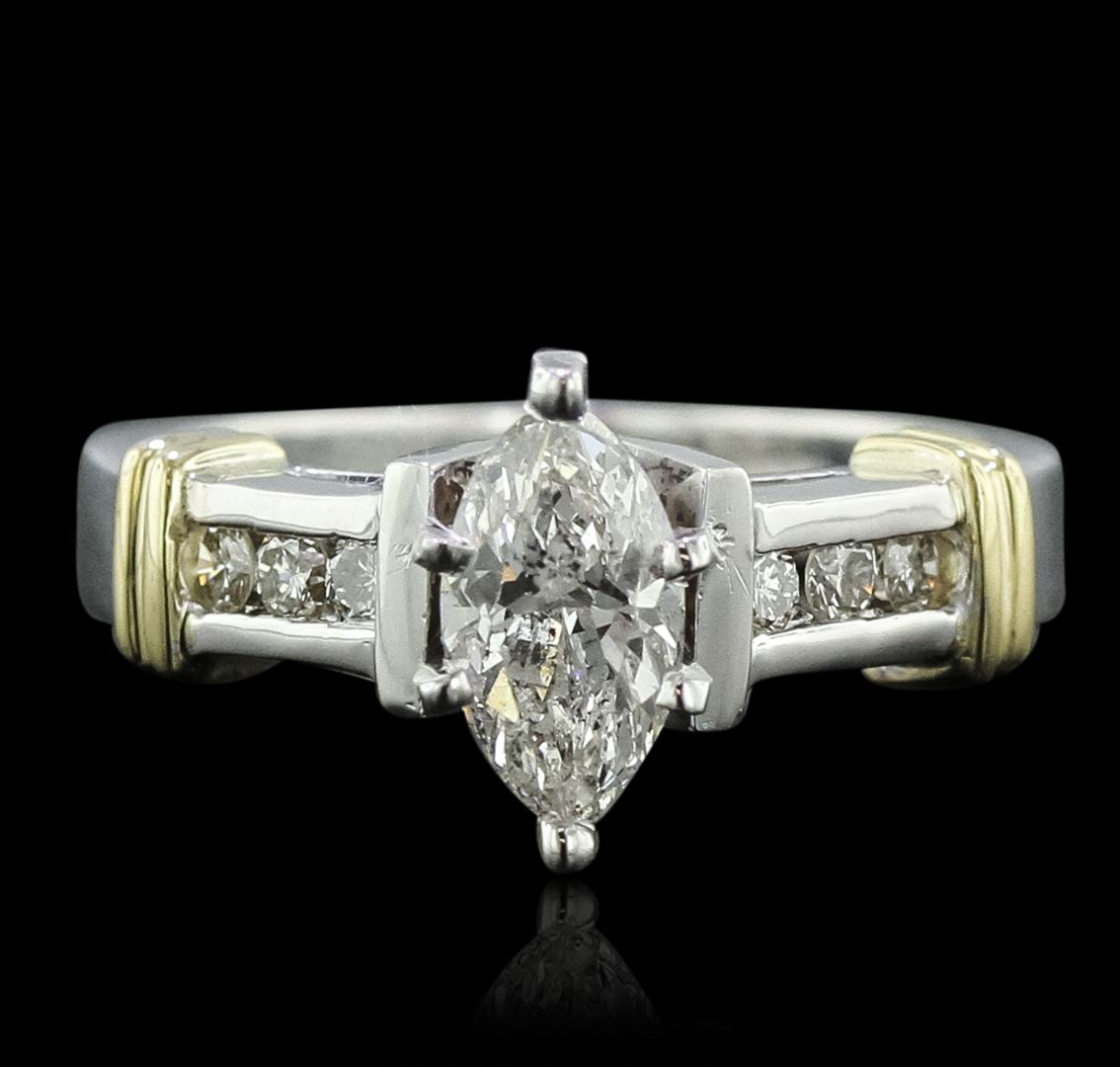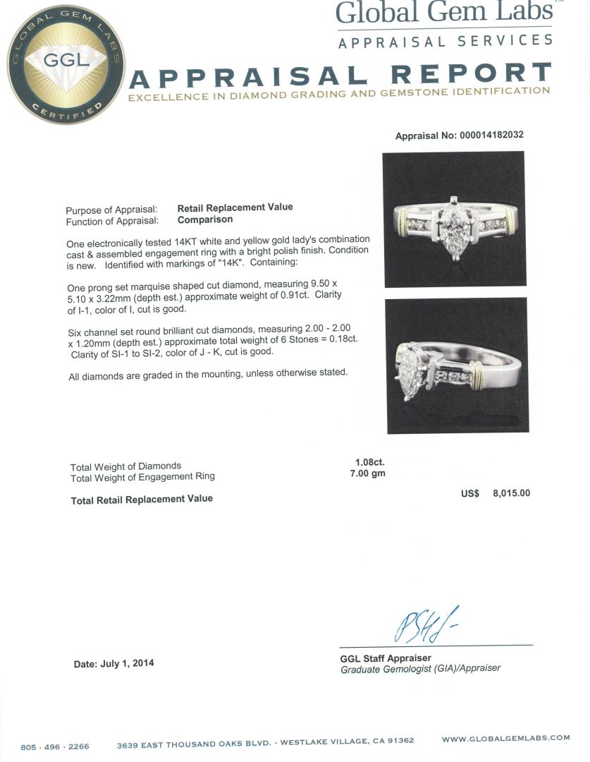 One electronically tested 14KT white and yellow gold Ladies combination cast & assembled engagement ring with a bright polish finish. Condition is new. Identified with markings of "14K". Containing: One prong set marquise shaped cut diamond, measuring 9.50 x 5.10 x 3.22mm (depth est.) approximate weight of 0.91ct. Clarity: I-1. Color: I, Cut is Good. Six channel set round brilliant cut diamonds, measuring 2.00 - 2.00 x 1.20mm (depth est.) approximate total weight of 6 Stones = 0.18ct. Clarity: SI-1 to SI-2. Color: J - K, Cut is Good. All diamonds are graded in the mounting, unless otherwise stated. Total Weight of Diamonds 1.08ct. Total Weight of Engagement Ring 7.00 grams. GGL Appraised at $8,015.00.