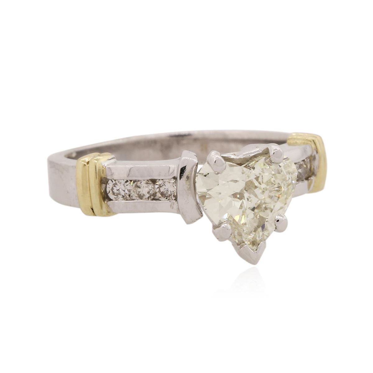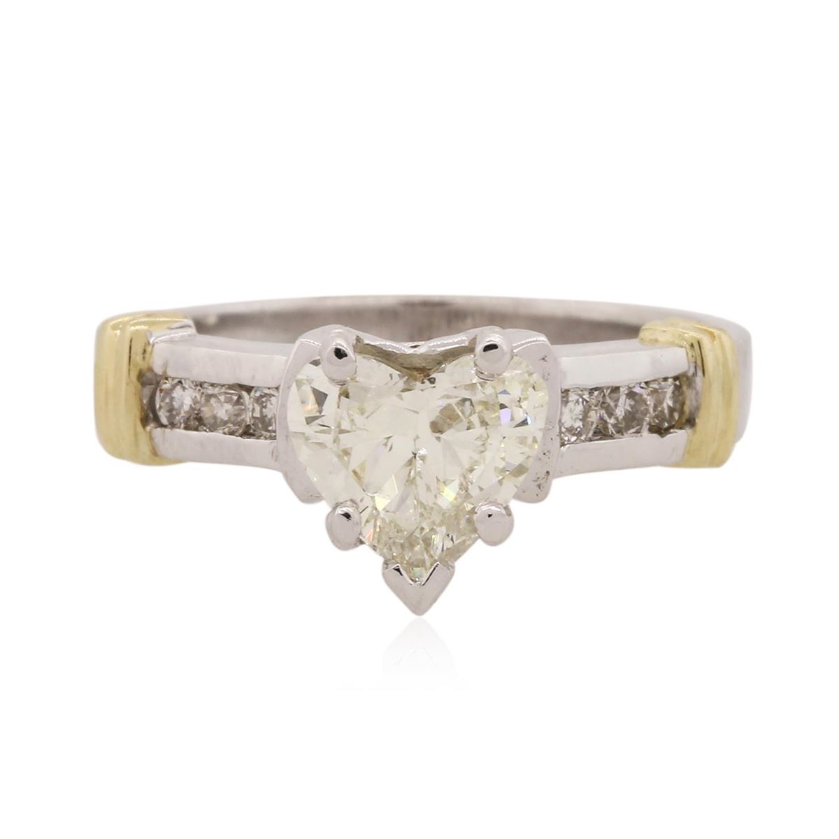 One electronically tested 14KT white and yellow gold Ladies combination cast & assembled engagement ring with a bright polish finish. Condition is new. Identified with markings of "14K". Containing: One prong set heart shaped cut diamond, measuring 7.40 x 6.50 x 4.10mm (depth est.) approximate weight of 1.16ct. Clarity: SI-1. Color: L, Cut is Good. Six channel set round brilliant cut diamonds, measuring 1.80 - 1.80 x 1.08mm (depth est.) approximate total weight of 6 Stones = 0.13ct. Clarity: SI-2. Color: I - J, Cut is Good. All diamonds are graded in the mounting, unless otherwise stated. Total Weight of Diamonds 1.29ct. Total Weight of Engagement Ring 4.30 grams. GGL Appraised at $9,815.00.