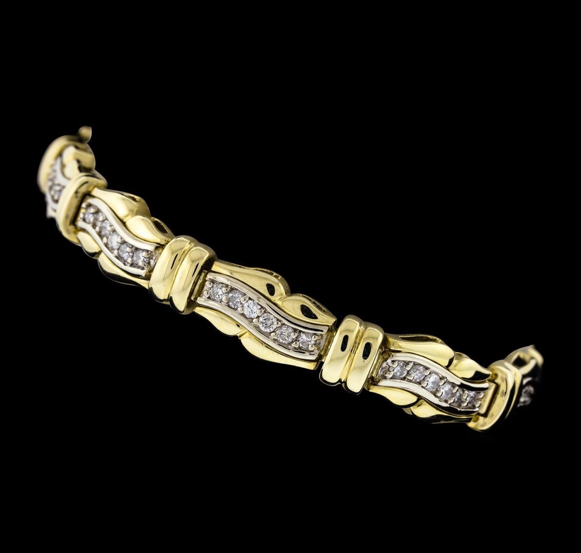 One electronically tested 14KT yellow and white gold lady's combination cast & assembled fashion bracelet with a tongue clasp with fold over safety with a bright polish finish. The featured lady's bracelet measures approximately 7 inches in length. Identified with markings of "14K". Condition is new, good workmanship. Containing: Sixty prong set round brilliant cut diamonds, measuring 1.90 - 1.80 x 1.15mm (depth est.) approximate total weight of 60 Stones = 1.50ct. Graded in the setting. Clarity: SI-1 to I-1. Color: H - ICut Good. Total Weight of Diamonds 1.50ct. Total Weight of Bracelet 22.20gm. GAS Appraised.