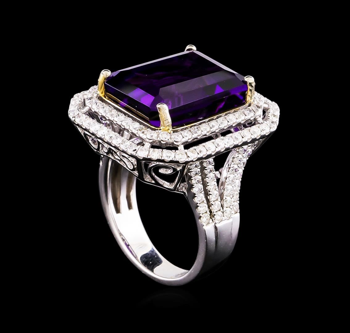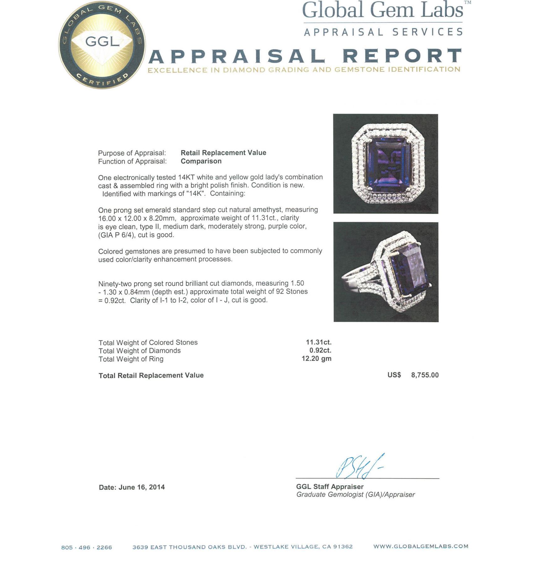 One electronically tested 14KT white and yellow gold Ladies combination cast & assembled ring with a bright polish finish. Condition is new. Identified with markings of "14K". Containing: One prong set emerald standard step cut natural amethyst, measuring 16.00 x 12.00 x 8.20mm, approximate weight of 11.31ct., clarity is eye clean, type II, medium dark, moderately strong, purple color, (GIA P 6/4), cut is good. Colored gemstones are presumed to have been subjected to commonly used color/clarity enhancement processes. Ninety-Two prong set round brilliant cut diamonds, measuring 1.50 - 1.30 x 0.84mm (depth est.) approximate. Total Weight of 92 Stones = 0.92ct. Clarity: I-1 to I-2. Color: I - J, Cut is Good. Total Weight of Colored Stones 11.31ct. Total Weight of Diamonds 0.92ct. Total Weight of Ring 12.20 grams. GGL Appraised at $8,755.00.