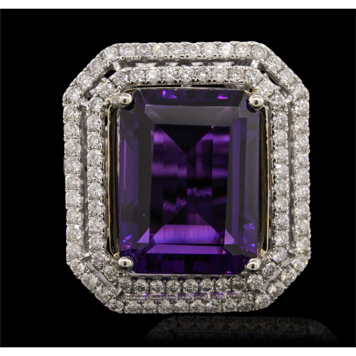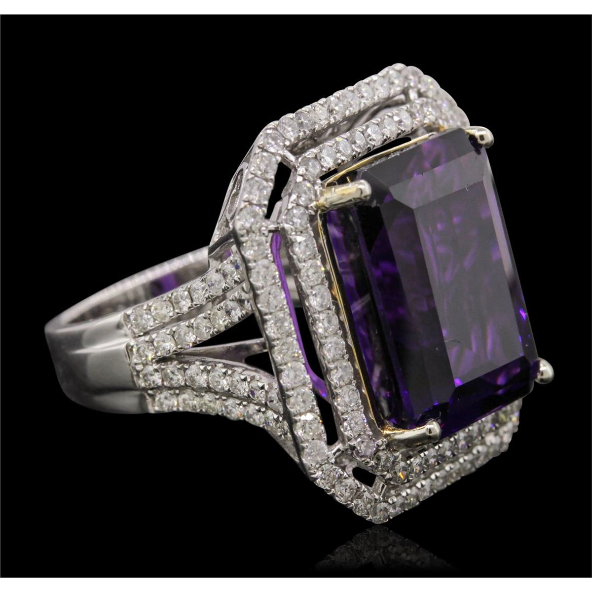 One electronically tested 14KT white and yellow gold Ladies combination cast & assembled ring with a bright polish finish. Condition is new. Identified with markings of "14K". Containing: One prong set emerald standard step cut natural amethyst, measuring 16.00 x 12.00 x 8.20mm, approximate weight of 11.31ct., clarity is eye clean, type II, medium dark, moderately strong, purple color, (GIA P 6/4), cut is good. Colored gemstones are presumed to have been subjected to commonly used color/clarity enhancement processes. Ninety-Two prong set round brilliant cut diamonds, measuring 1.50 - 1.30 x 0.84mm (depth est.) approximate. Total Weight of 92 Stones = 0.92ct. Clarity: I-1 to I-2. Color: I - J, Cut is Good. Total Weight of Colored Stones 11.31ct. Total Weight of Diamonds 0.92ct. Total Weight of Ring 12.20 grams. GGL Appraised at $8,755.00.
